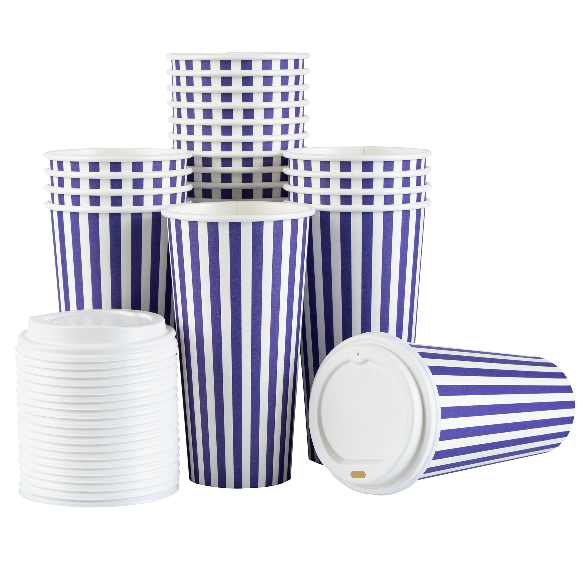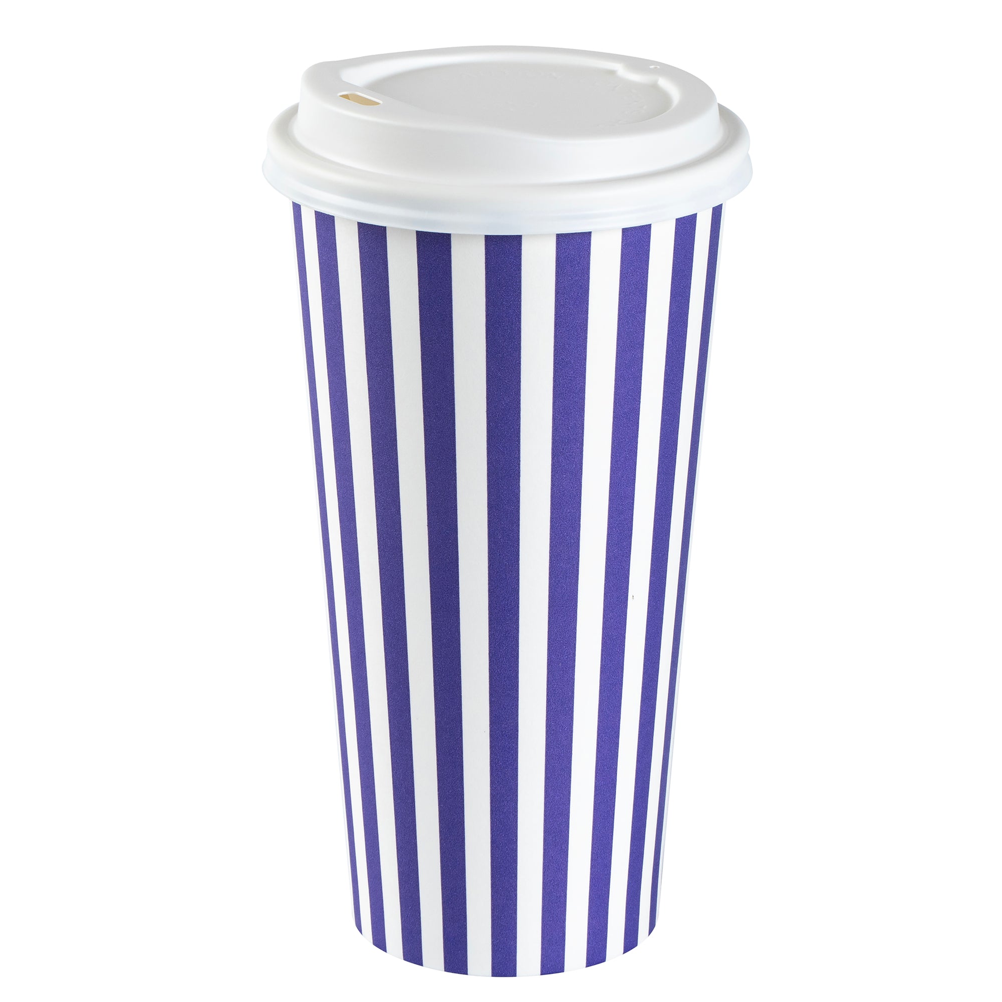 Begin your day with our Restpresso 20-ounce Purple and White Stripe Paper Single Wall Coffee Cups. Crafted with a greaseproof PE liner, these paper coffee cups reduce unwanted leaks and spills, ensuring a clean and convenient drinking experience. These disposable hot cups are expertly designed to hold hot and cold beverages, making them a versatile choice for any refreshment. Celebrate the uniqueness of these single wall coffee cups, featuring a vibrant purple and white stripe finish that adds a pop of color to your morning routine. These disposable coffee cups come with a white lid for sipping on the go. The stackable design of these recyclable hot tea cups saves valuable storage space in your establishment. Enjoy the secure and comfortable grip provided by the rolled rim of these beverage cups, enhancing your customers' drinking experience. The leak-resistant seam of these drinking cups is designed to ensure that your beverage remains inside your cup, not on your clothes. Coordinate these elegant coffee cups with our assortment of sleeves, ensuring a sophisticated and burn-free coffee session. With a generous capacity of 20 ounces, these hot cups are perfect for that large morning coffee or tea. Measuring 3.5 inches in diameter by 6.5 inches in height, these striped coffee cups the ideal size for your daily caffeine fix. Sold in a 400 count box. Sleeves are available and sold separately.