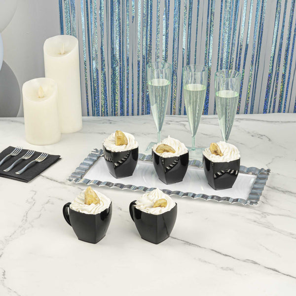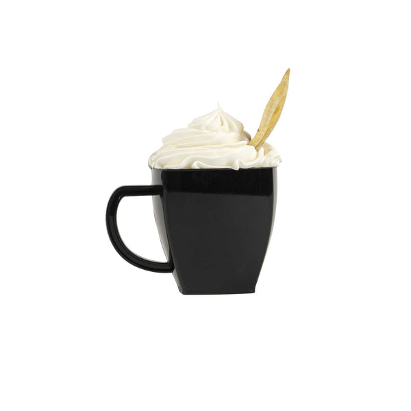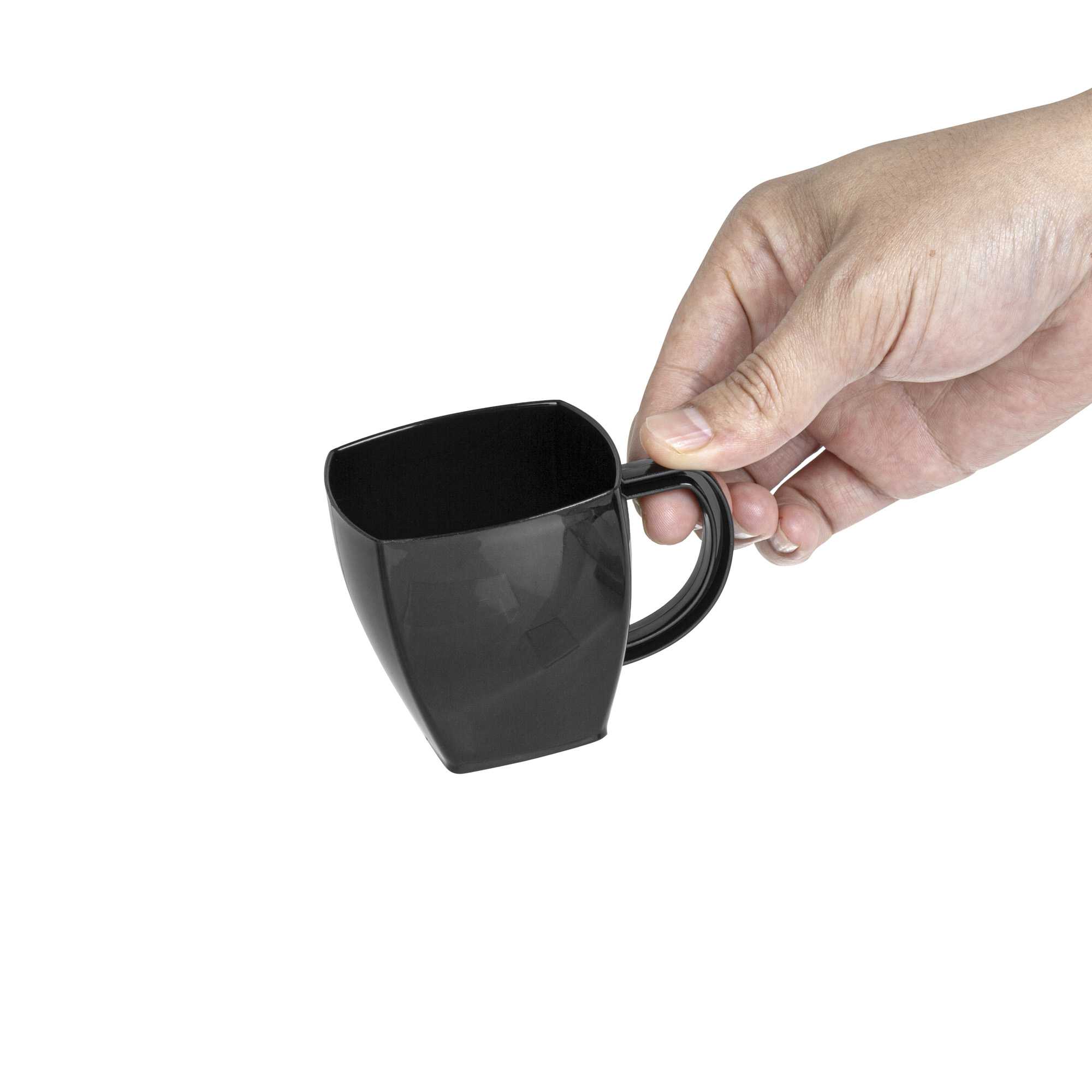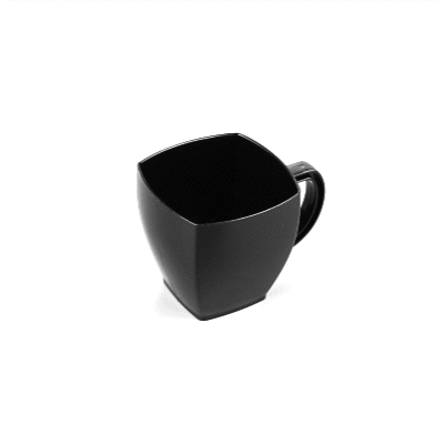 Bring sophistication to your customers' coffees with our Restpresso 5-ounce Square Black Plastic Cafe Cups. These black coffee mugs are made from durable PS plastic, making them sturdy enough to hold hot beverages without warping or shattering. To ensure a quick and easy cleaning process, these plastic tea cups are disposable. These black cafe cups are designed with a deep broad basin and a sturdy, wide handle for the customers to lift and hold hot beverages comfortably. With a versatile design, these black plastic cups can also be used to serve individual-sized appetizers, tapas, and desserts. The black finish of these mini coffee cups adds a timeless and tasteful look to any event. These tea cups for cafes measure 2.5 inches in diameter by 2.5 inches in height and hold 5 ounces. Sold in a 100 count box.