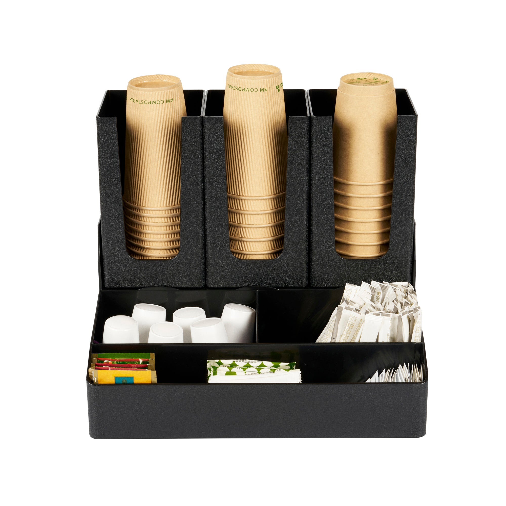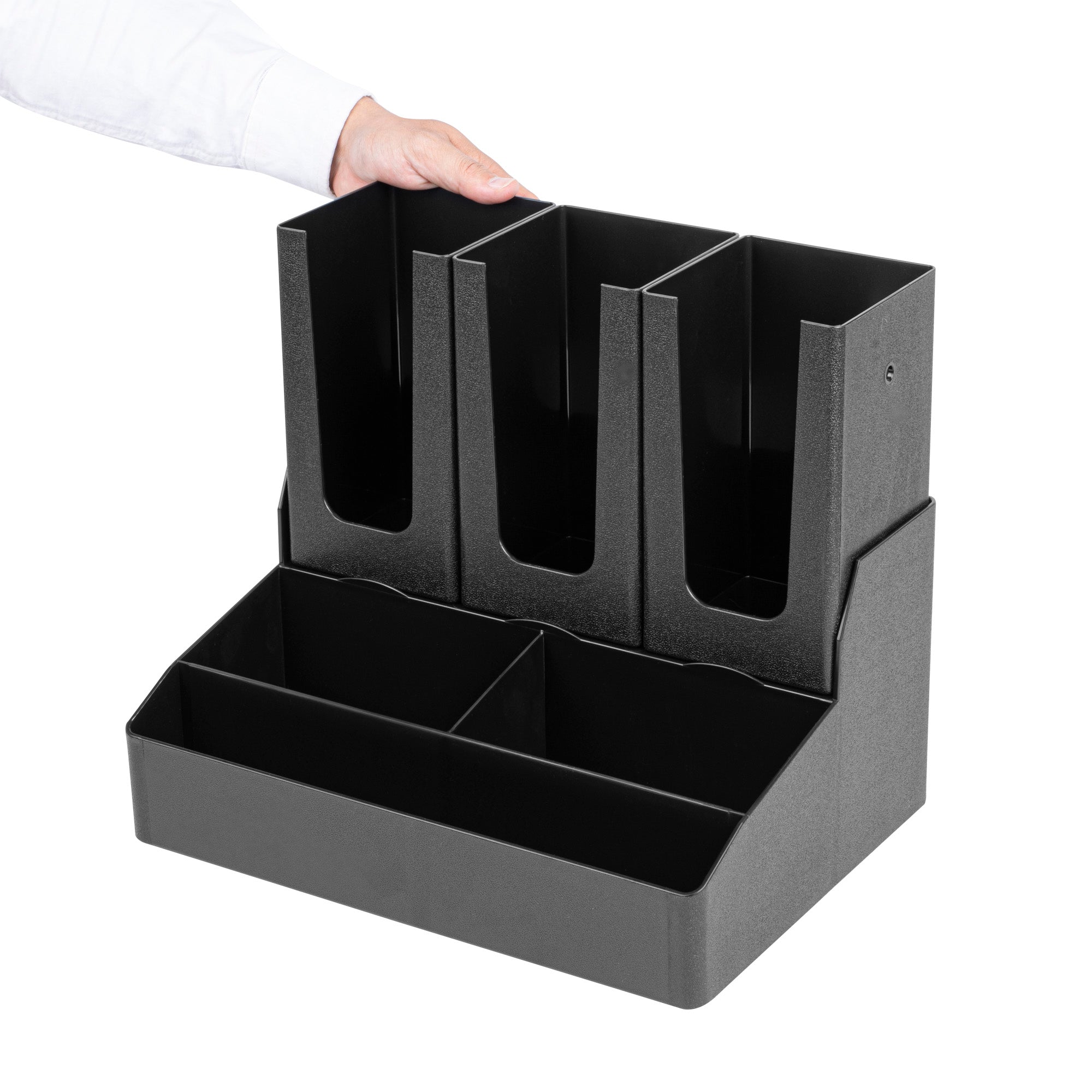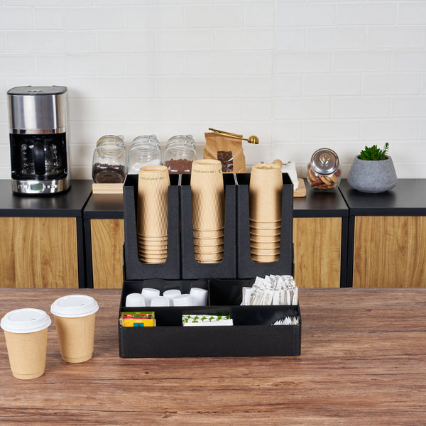 Elevate the organization of your coffee station with our Restpresso Black Plastic Coffee Cup / Lid / Condiment Organizer. This coffee organizer features six compartments, perfect for keeping lids and coffee cups neatly arranged and easily accessible. The open design of this countertop organizer lets staff easily monitor supply levels at a glance, ensuring you do not run out of beverage supplies during peak hours. Crafted from premium plastic, this organizer is designed for long-lasting use, providing reliable storage for your beverage supplies. With a compact design, this plastic organizer fits seamlessly into any space, maximizing efficiency without taking up too much room. The black finish of this coffee caddy adds a touch of sophistication while complementing any coffee station setup. Measuring 13.98 inches in length by 10.43 inches in width by 12.28 inches in height, this black organizer offers ample storage without compromising space. Sold in a 1 count box.