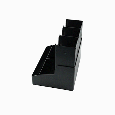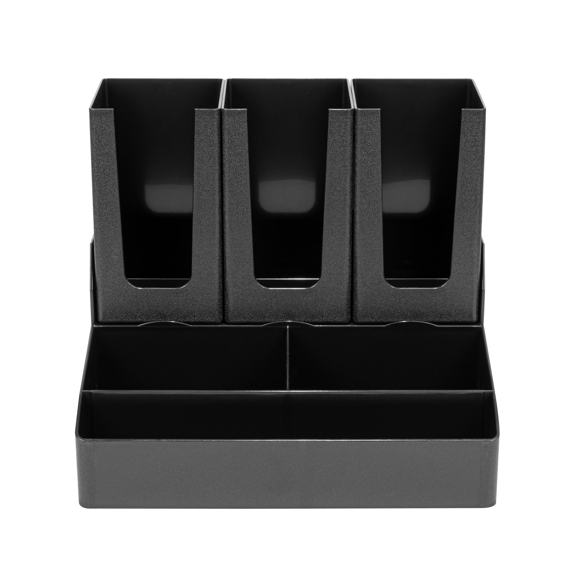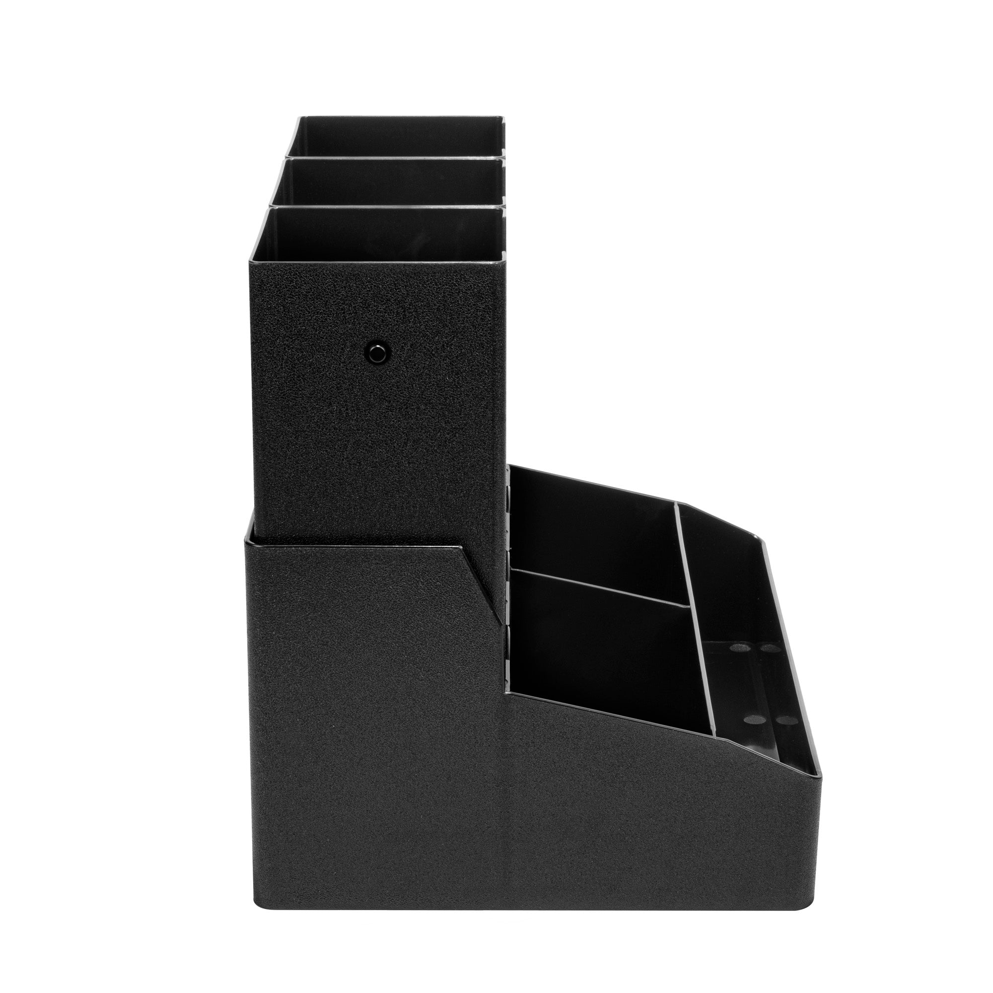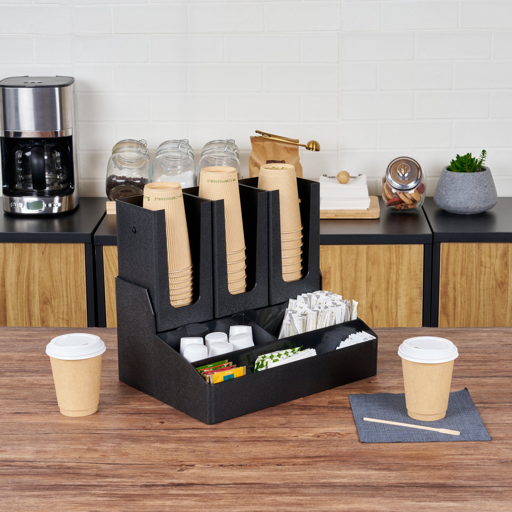 Elevate the organization of your coffee station with our Restpresso Black Plastic Coffee Cup / Lid / Condiment Organizer. This coffee organizer features six compartments, perfect for keeping lids and coffee cups neatly arranged and easily accessible. The open design of this countertop organizer lets staff easily monitor supply levels at a glance, ensuring you do not run out of beverage supplies during peak hours. Crafted from premium plastic, this organizer is designed for long-lasting use, providing reliable storage for your beverage supplies. With a compact design, this plastic organizer fits seamlessly into any space, maximizing efficiency without taking up too much room. The black finish of this coffee caddy adds a touch of sophistication while complementing any coffee station setup. Measuring 13.98 inches in length by 10.43 inches in width by 12.28 inches in height, this black organizer offers ample storage without compromising space. Sold in a 1 count box.