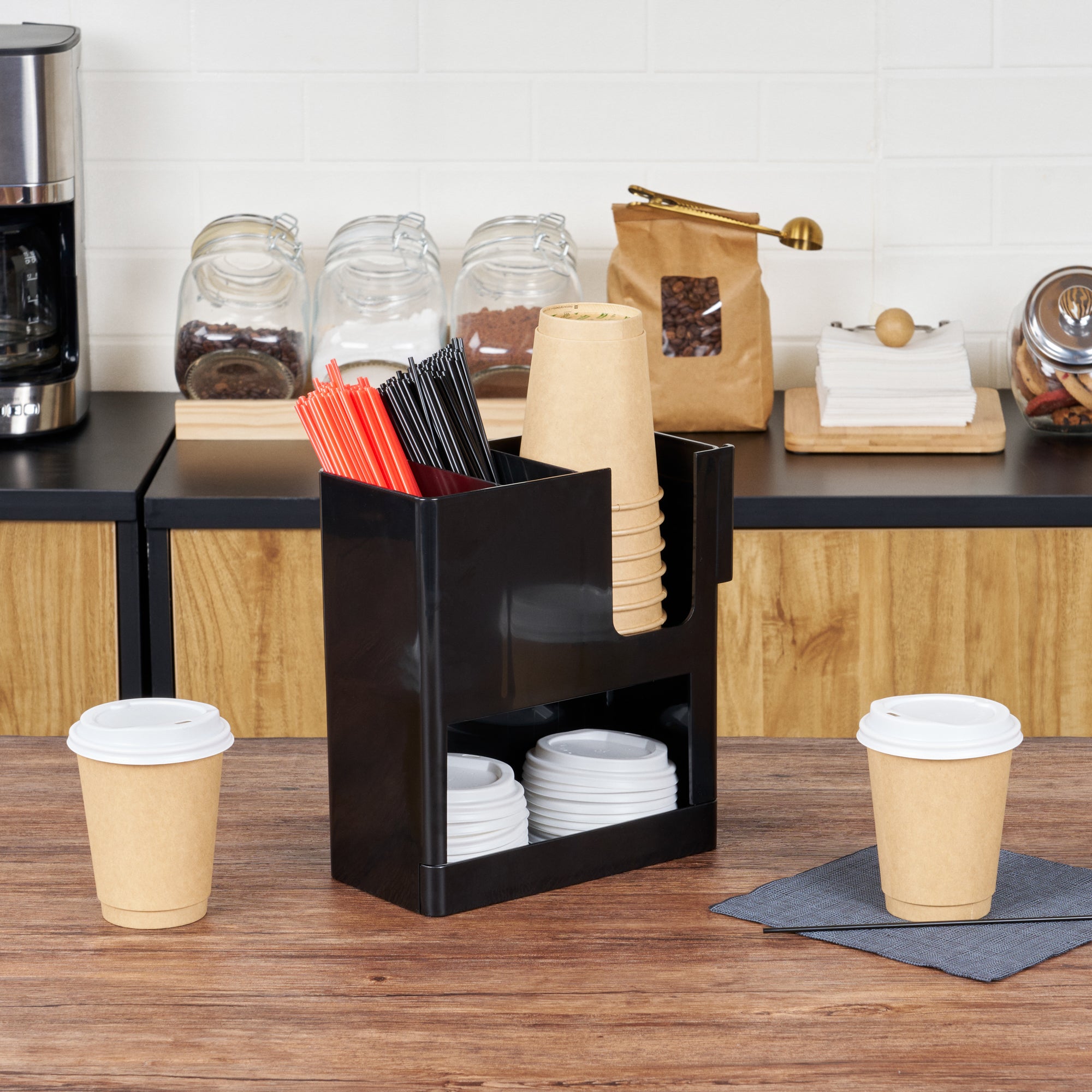 BLACK PLASTIC COFFEE CUP / LID / STRAW ORGANIZER - 4 SECTION