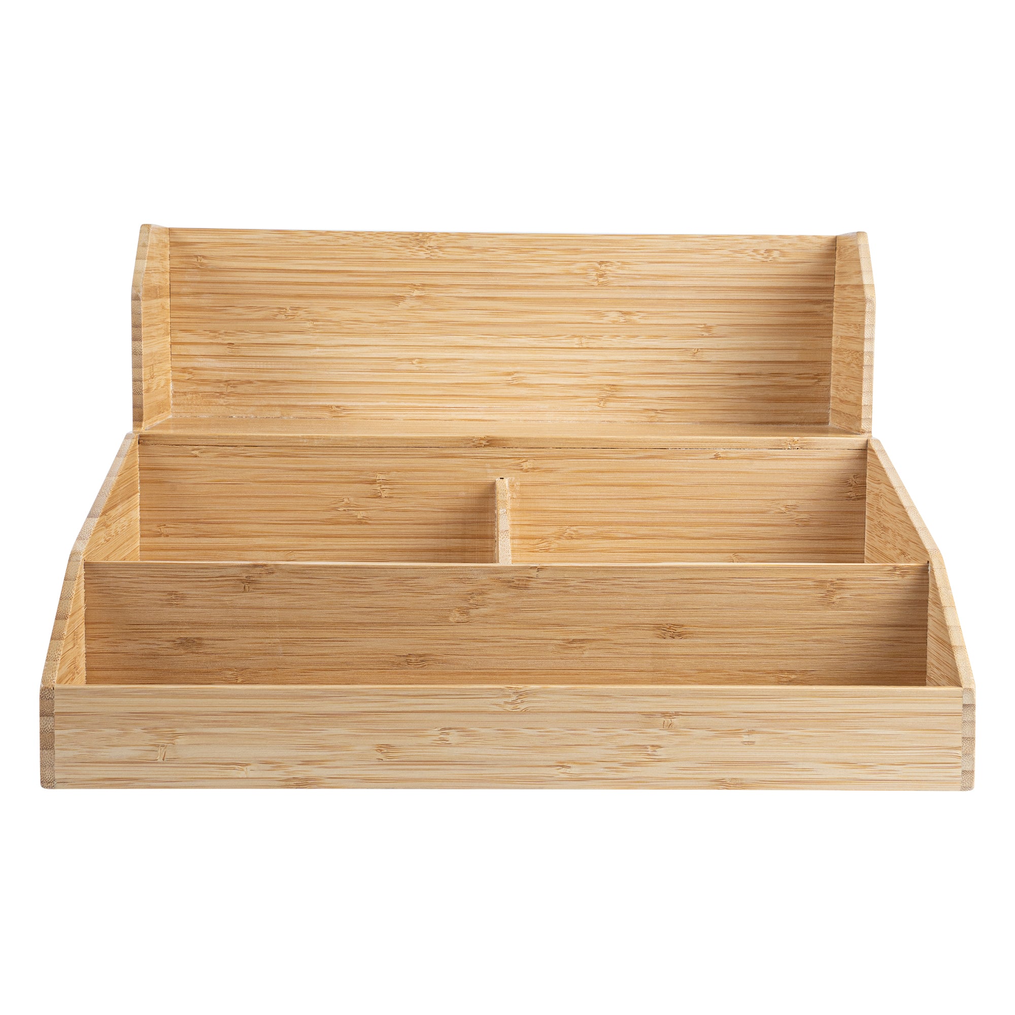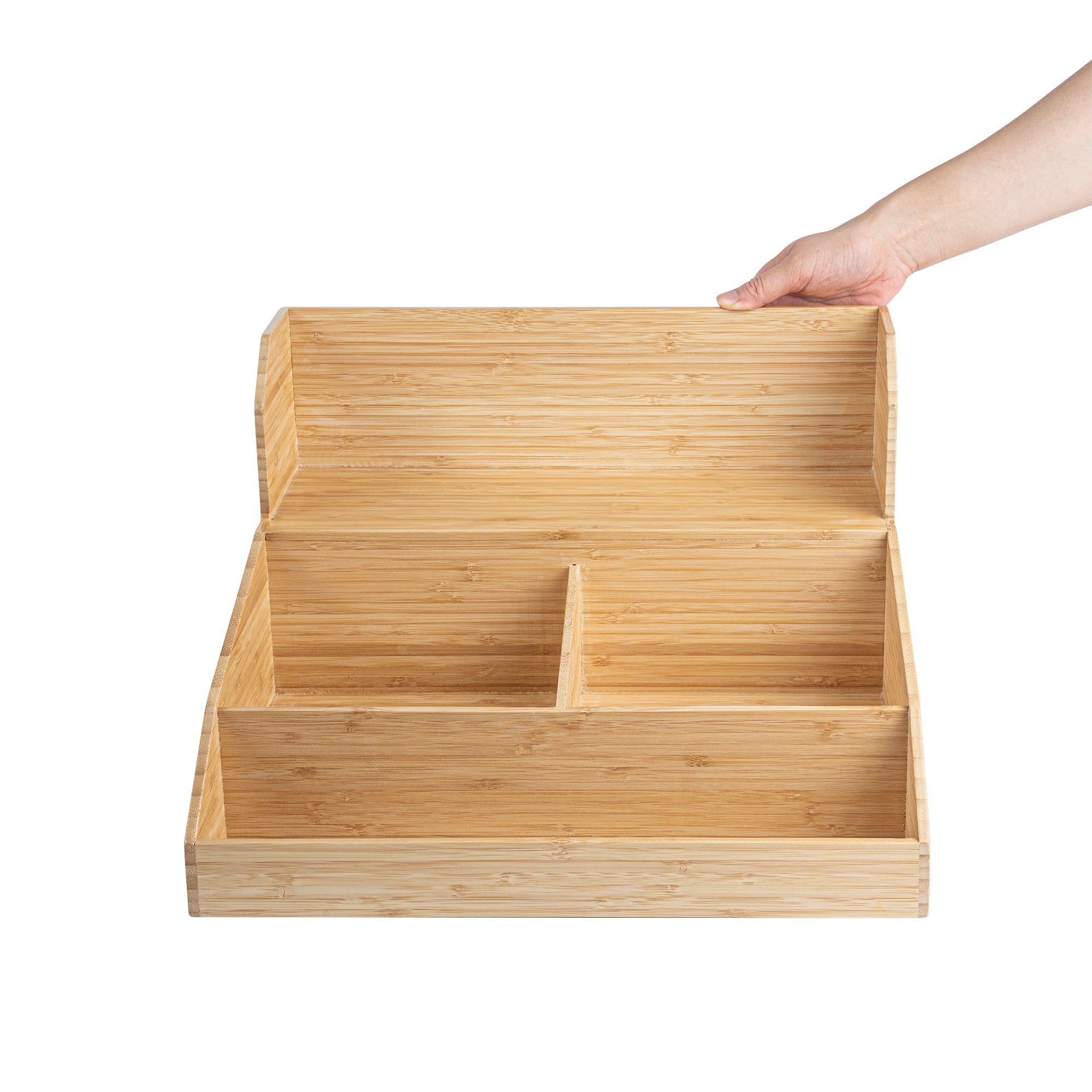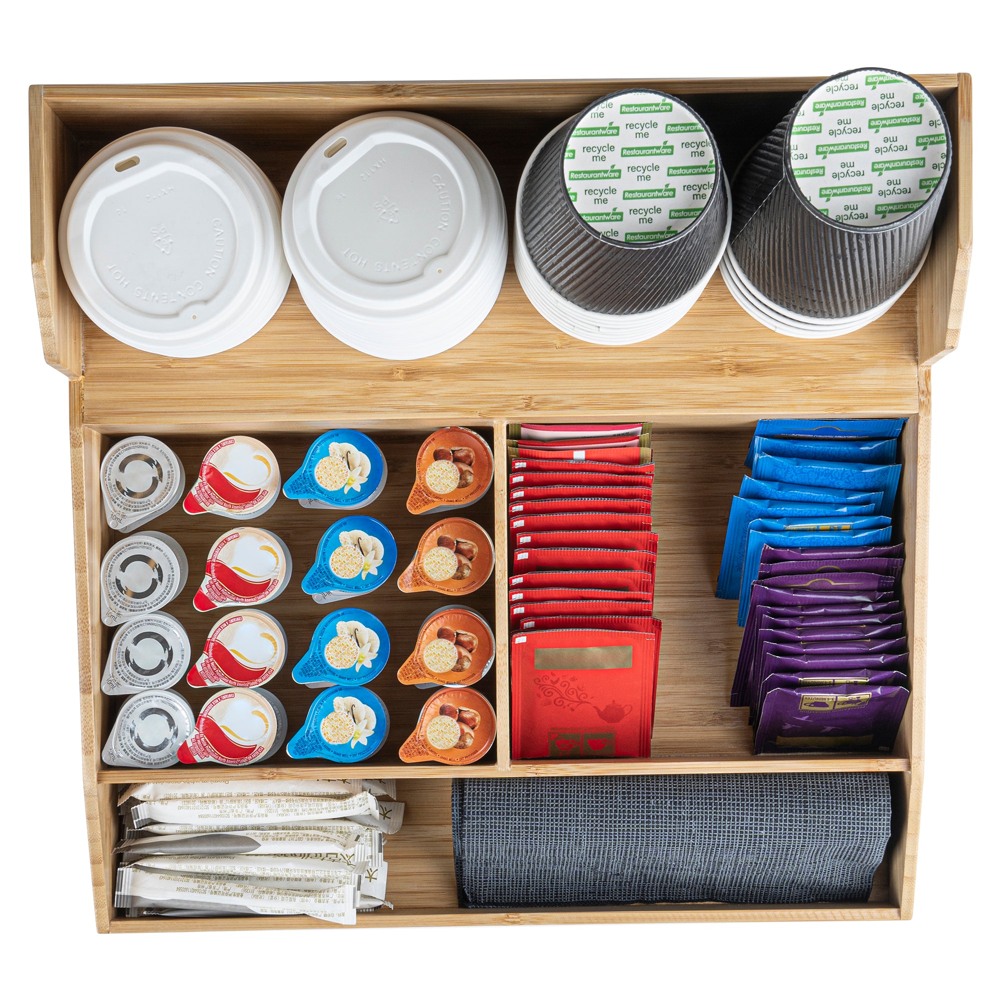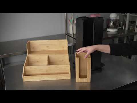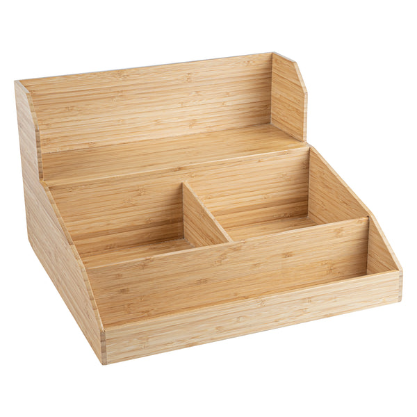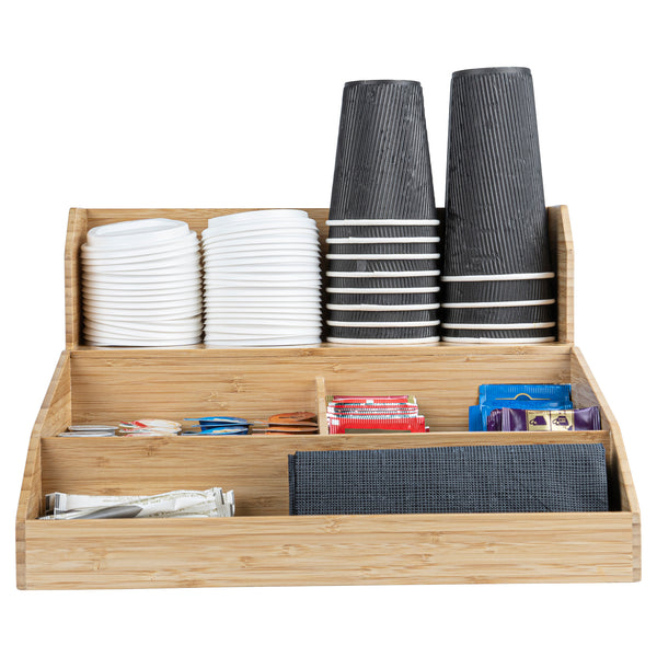 Enhance your beverage service with efficient organization solutions. The Restpresso Multi-Compartment Bamboo Condiment Organizer offers a spacious 15 inches by 14.25 inches by 9.25 inches design, perfect for accommodating coffee station essentials. Crafted from bamboo, this coffee station organizer provides a durable solution that effortlessly complements any countertop with its wood-grain finish. Its sturdy build ensures long-lasting use in busy cafes or hotel buffets. Featuring multiple compartments, this coffee cup organizer maximizes accessibility, allowing staff and guests to quickly grab what they need, thereby speeding up grab-and-go service. Lightweight and scratch-resistant, this organizer is ideal for easy repositioning and maintenance. Elevate your organization with this bamboo condiment organizer for a streamlined, professional presentation. Each order includes 1 Restpresso Multi-Compartment Bamboo Condiment Organizer.