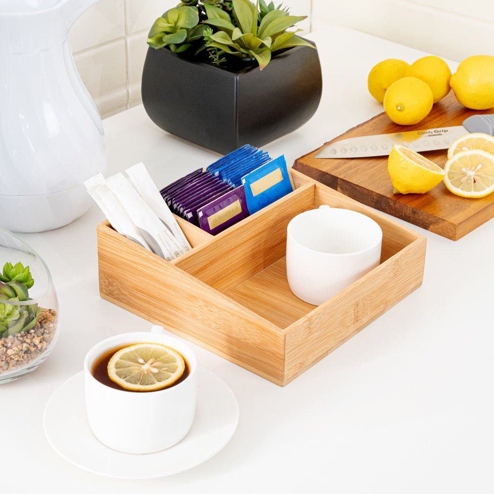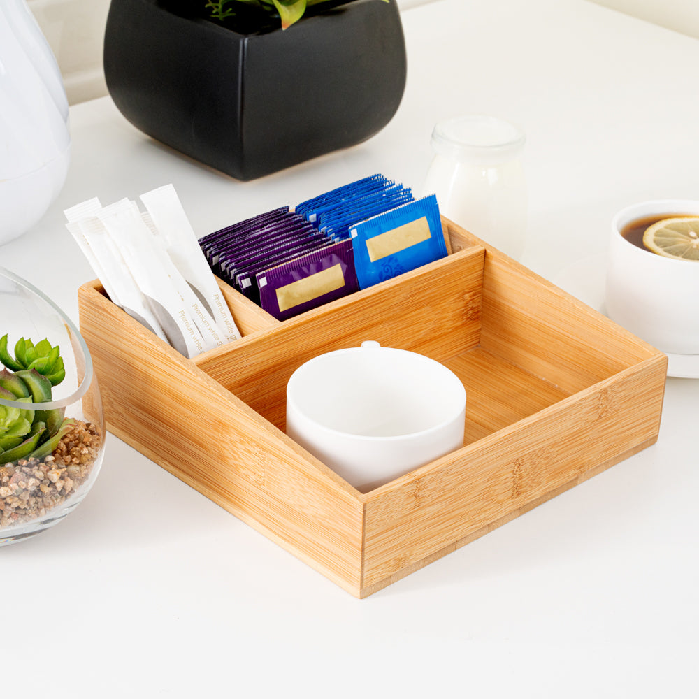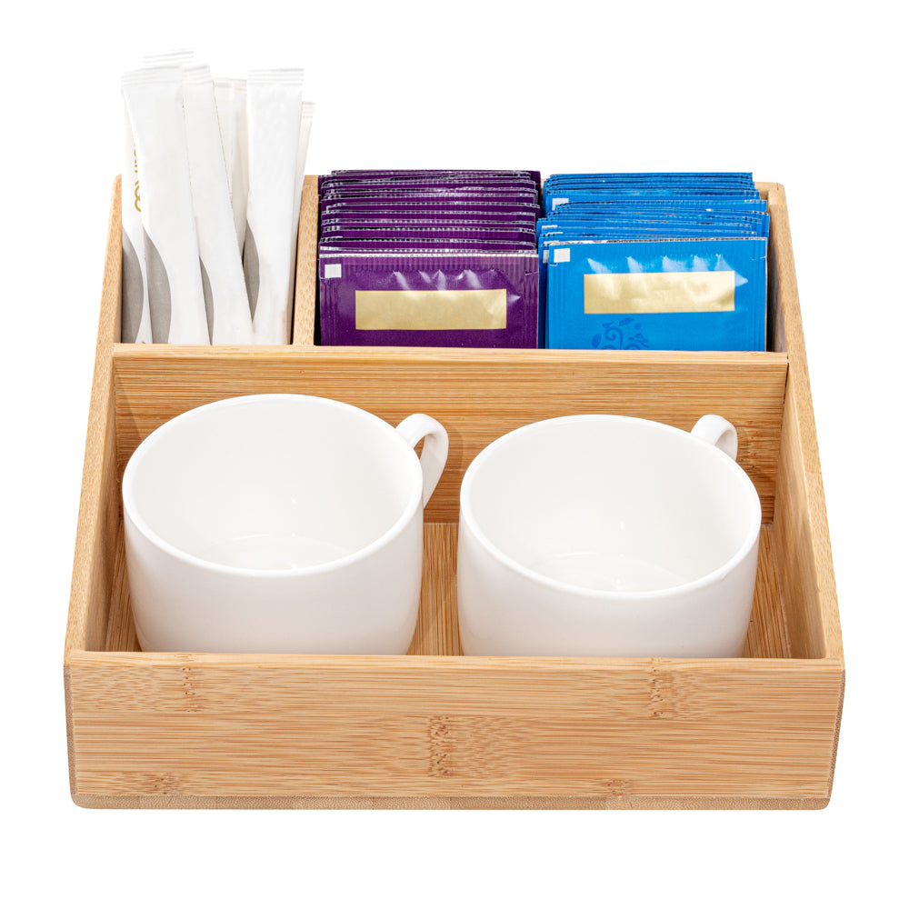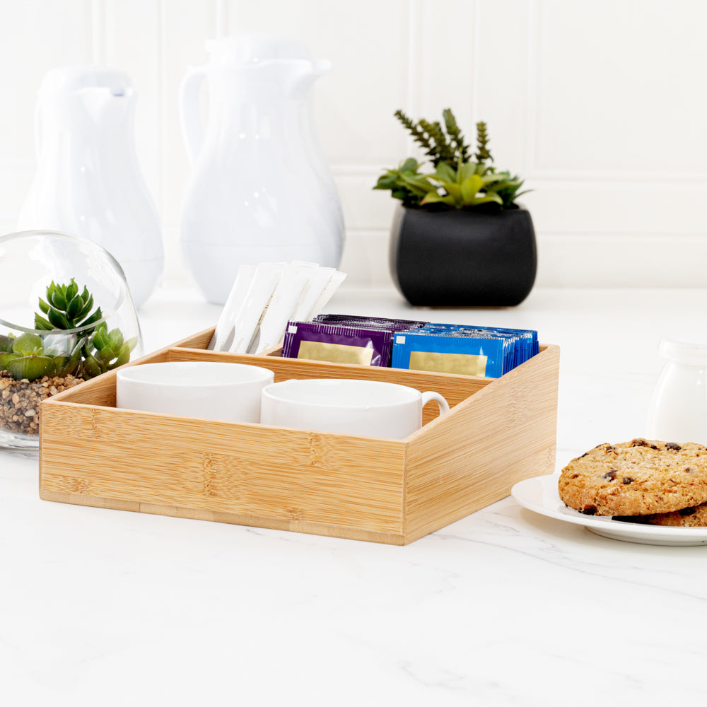 Our Restpresso Square Natural Bamboo Packet Organizer is the perfect way to organize an assortment of condiments. This durable coffee condiment organizer is crafted from sustainable bamboo and has an elegant, all-natural finish that effortlessly matches your decor. This chip-resistant tea and coffee organizer has 3 compartments which make it easy for your employees to neatly display tea mugs, sugar packets, stirrers, or other coffee supplies. With a total measurement of 8.25 inches long by 8.25 inches wide, this chic tea packet holder ensures that all of your coffee-making or tea-making essentials are organized in one spot. The largest compartment in this coffee supply organizer measures 7.8 inches long by 4.53 inches wide and is perfect for showcasing your tea mugs or coffee cups. The medium-sized compartment measures 5.7 inches long by 2.95 inches wide and is great for displaying sugar packets and creamers. The smallest compartment measures 2.95 inches long by 1.8 inches wide and is ideal for storing stirrers. Sold in a 1 count box.