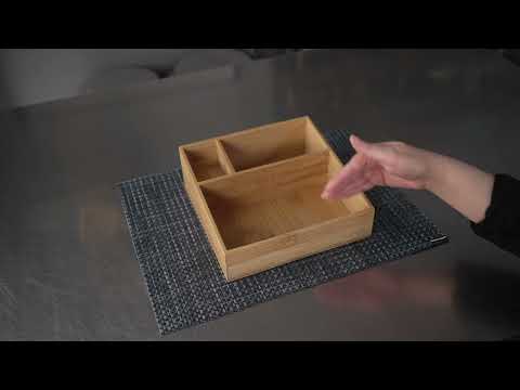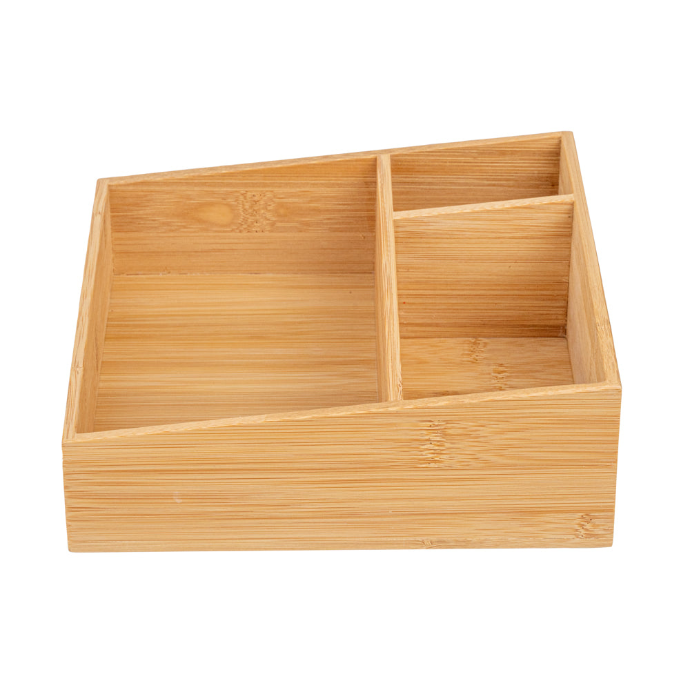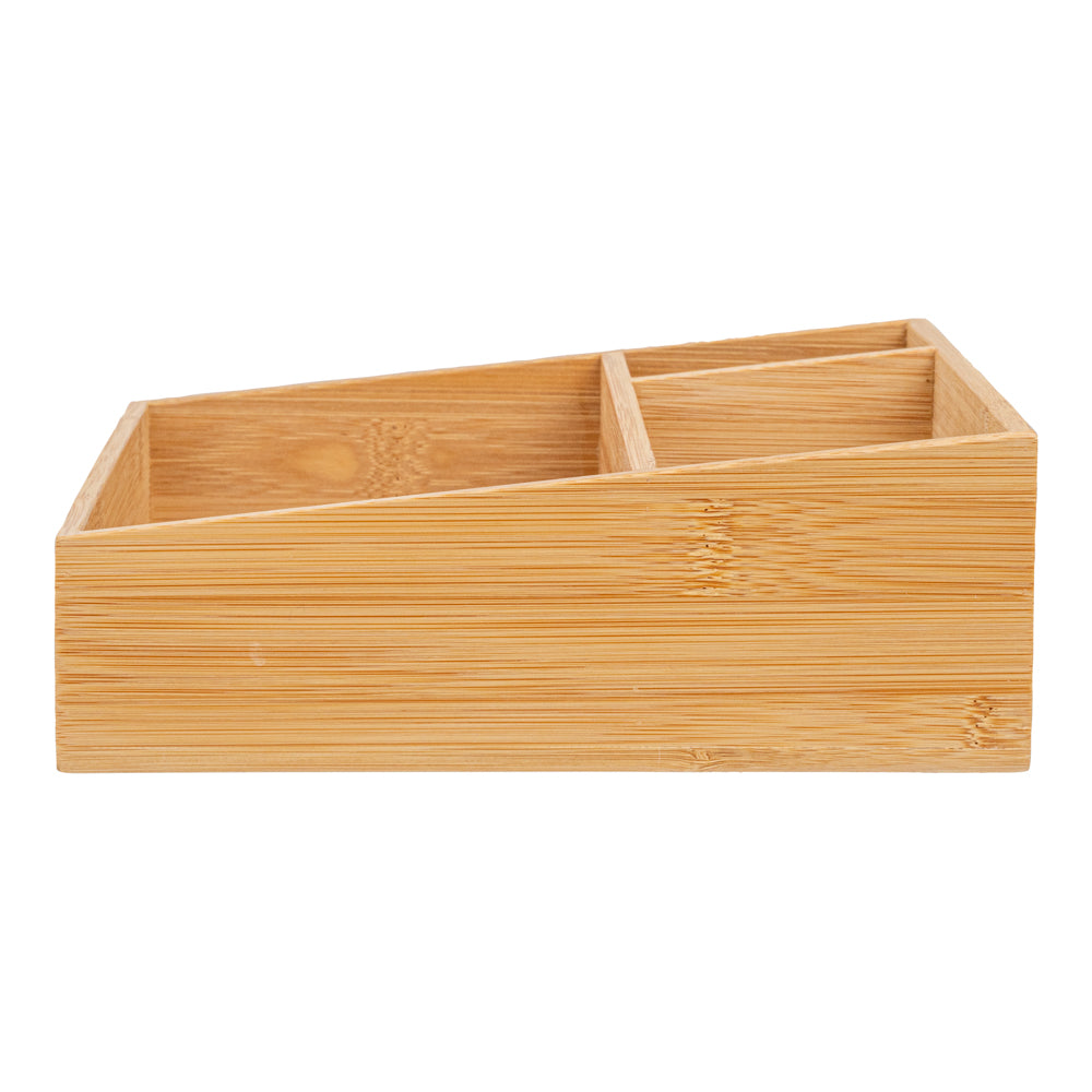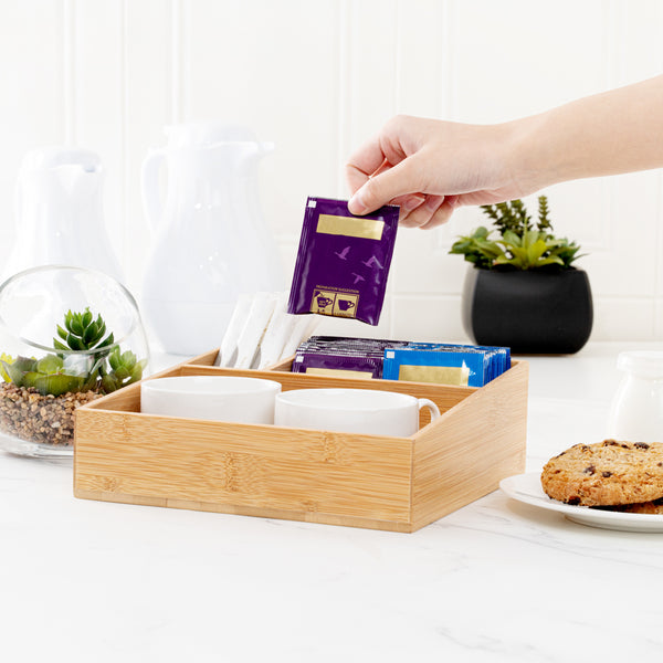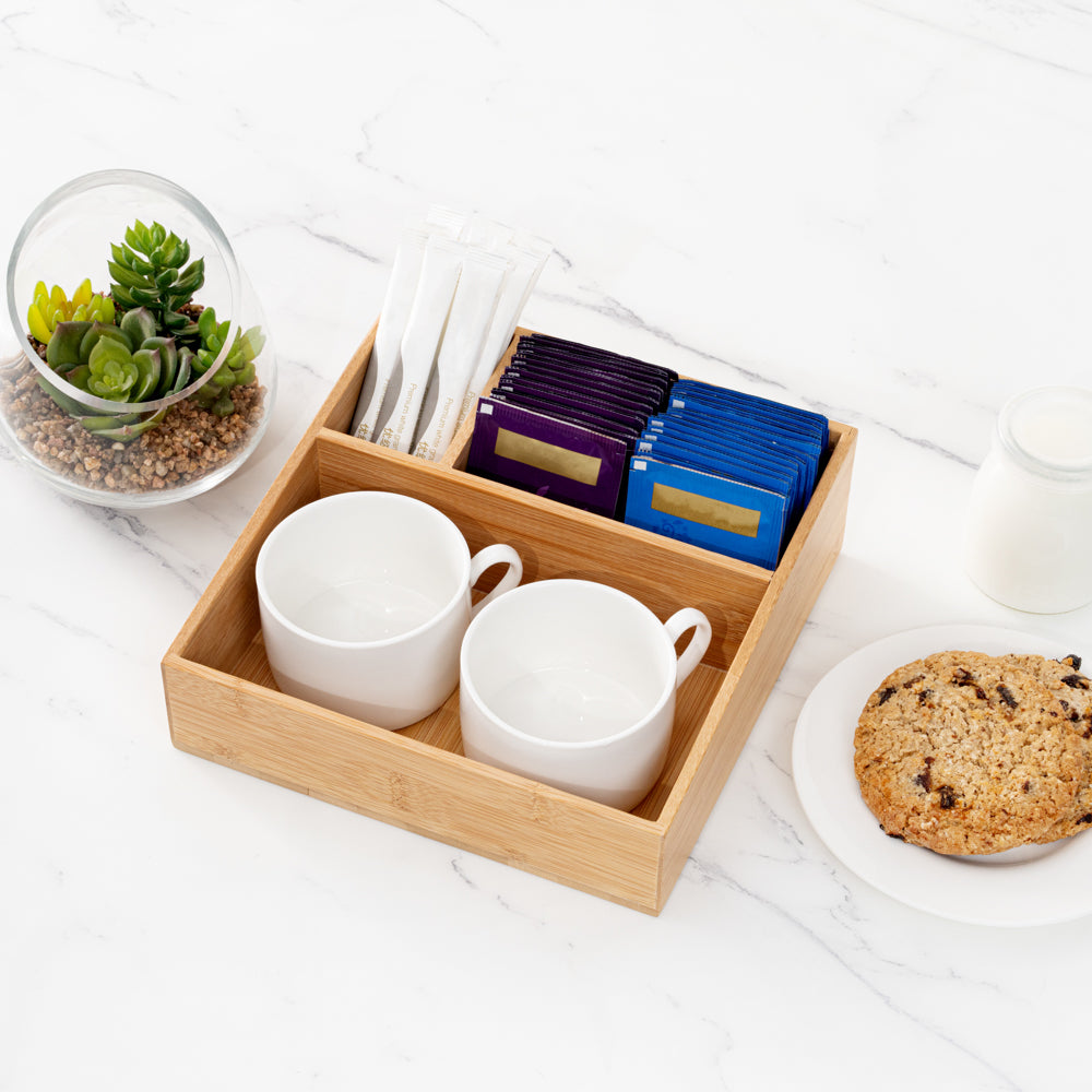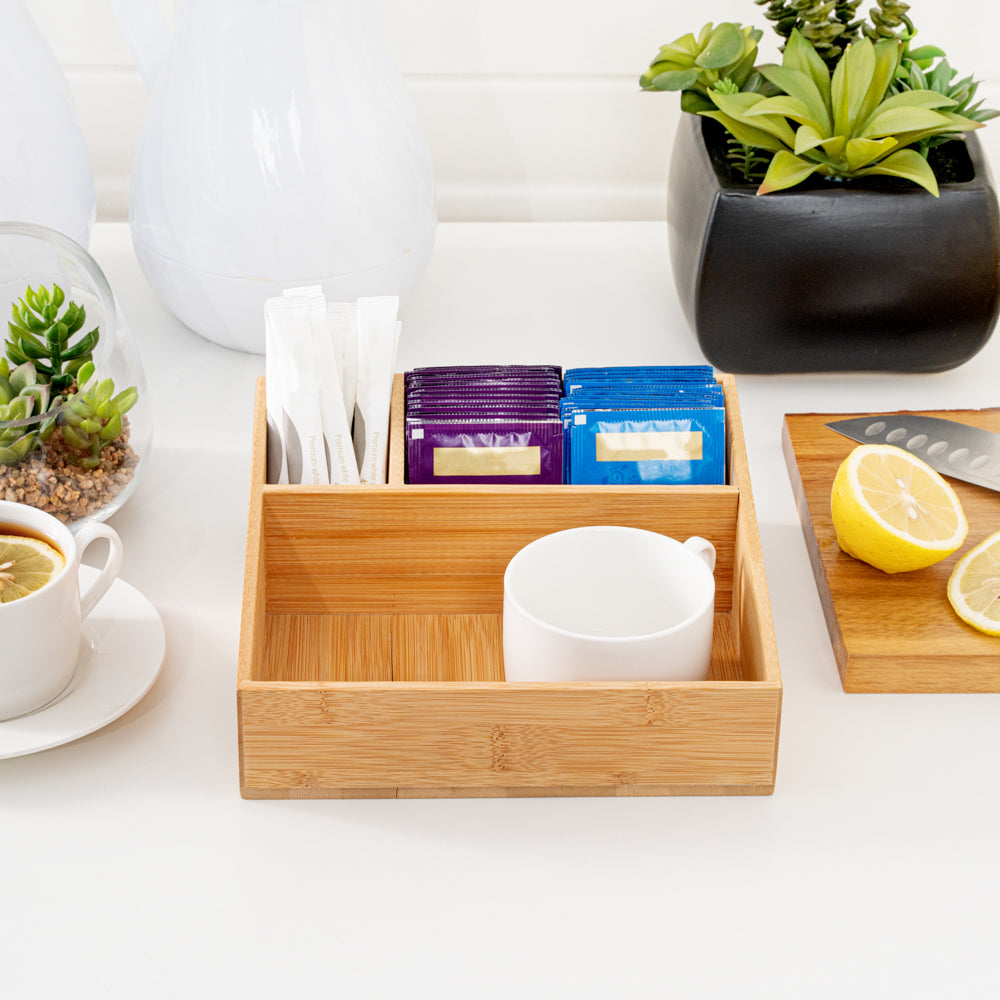 Our Restpresso Square Natural Bamboo Packet Organizer is the perfect way to organize an assortment of condiments. This durable coffee condiment organizer is crafted from sustainable bamboo and has an elegant, all-natural finish that effortlessly matches your decor. This chip-resistant tea and coffee organizer has 3 compartments which make it easy for your employees to neatly display tea mugs, sugar packets, stirrers, or other coffee supplies. With a total measurement of 8.25 inches long by 8.25 inches wide, this chic tea packet holder ensures that all of your coffee-making or tea-making essentials are organized in one spot. The largest compartment in this coffee supply organizer measures 7.8 inches long by 4.53 inches wide and is perfect for showcasing your tea mugs or coffee cups. The medium-sized compartment measures 5.7 inches long by 2.95 inches wide and is great for displaying sugar packets and creamers. The smallest compartment measures 2.95 inches long by 1.8 inches wide and is ideal for storing stirrers. Sold in a 1 count box.