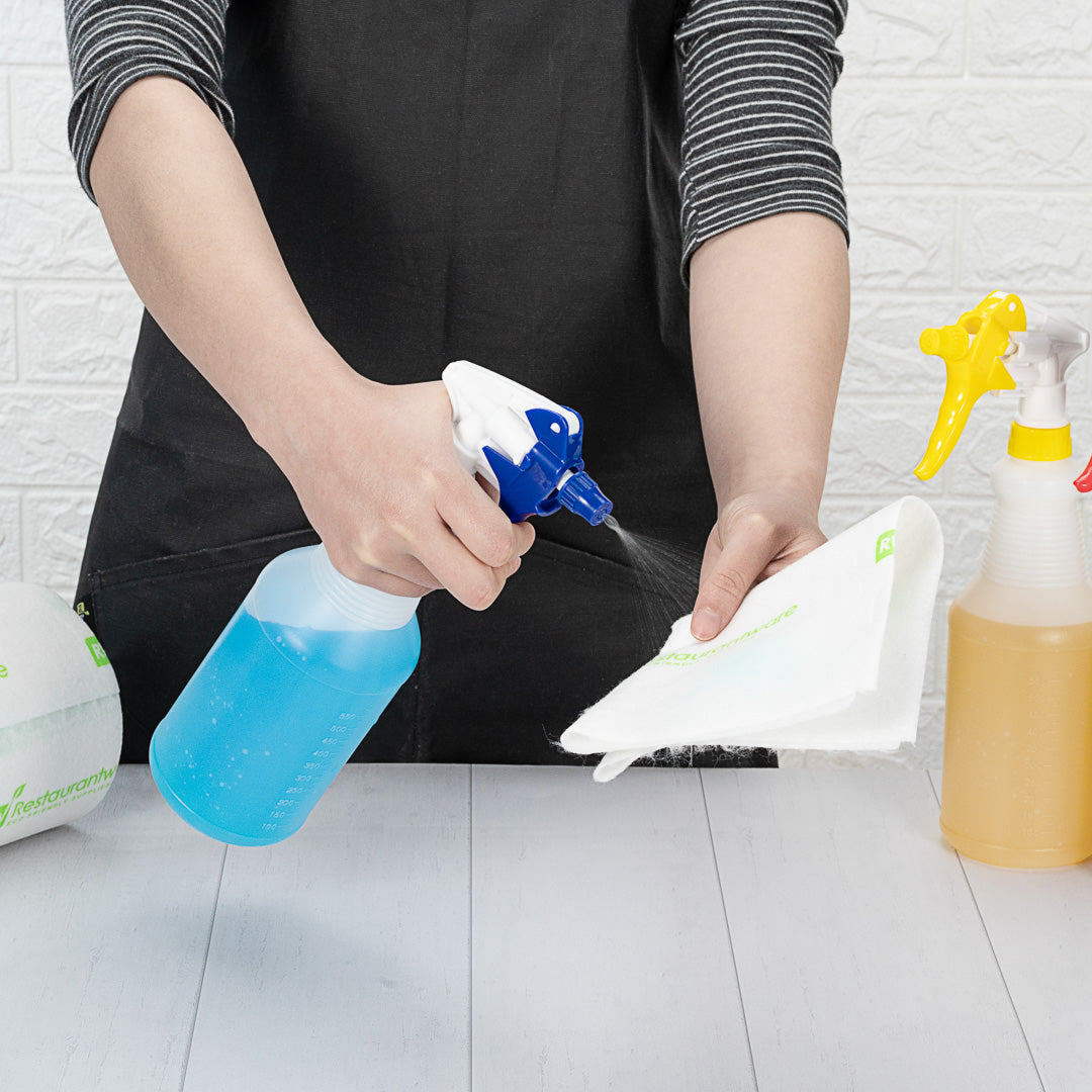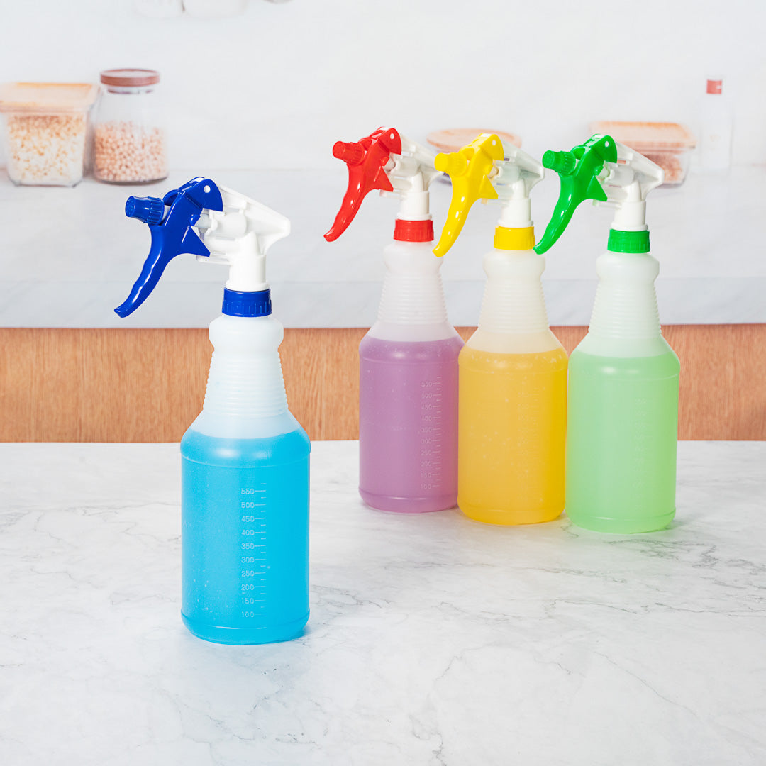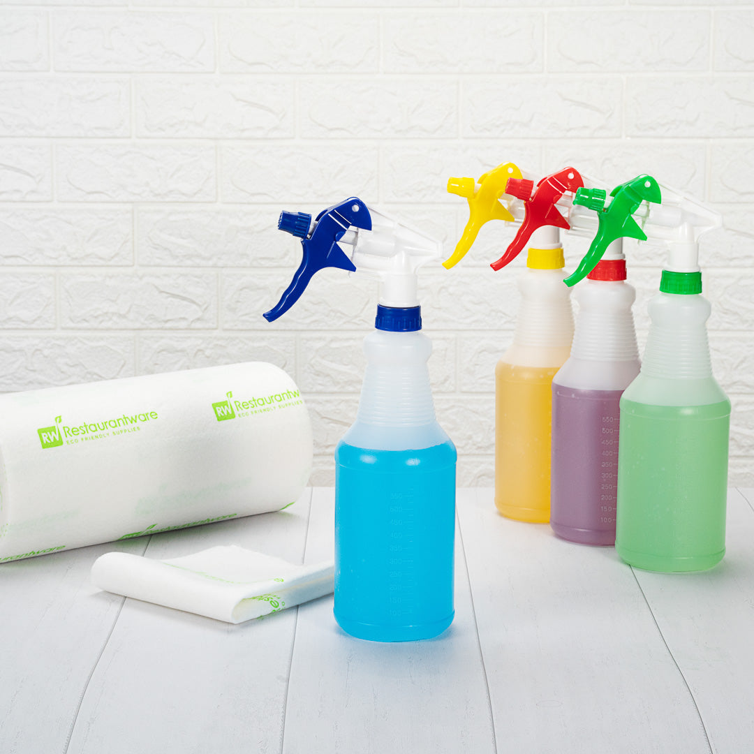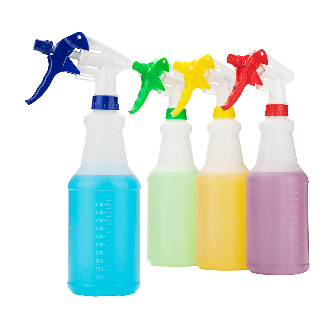 Keep your business spotless with our RW Clean Assorted 25 oz Plastic Spray Bottle Set. This empty spray bottle set has an adjustable nozzle with mist and stream settings for efficient cleaning at your foodservice establishment. Each order includes 1 yellow, 1 blue, 1 red, and 1 green plastic spray bottle, allowing you to stay organized and easily identify the liquids in each bottle. The molded graduations and measurement markers on this cleaning spray bottle set won't fade after multiple uses and allows you to measure cleaning solutions with ease. With an ergonomic trigger, this cleaning spray bottle set provides you with a comfortable way to spray equipment or surfaces while eliminating hand fatigue. This cleaning bottle set features a label-free design, allowing you to conveniently pair bottles with any cleaning solution. Each spray bottle contains up to 25 ounces and measures 3.1 inches in diameter by 11.6 inches in height. You will receive 4 plastic cleaning bottles per order.