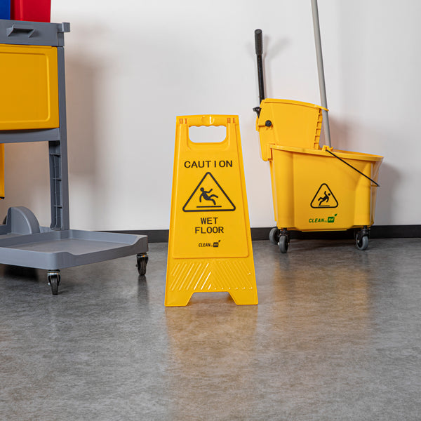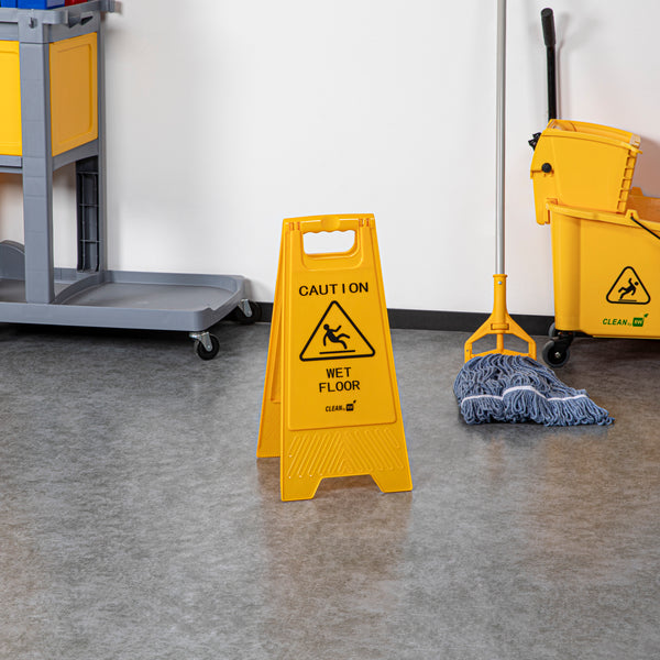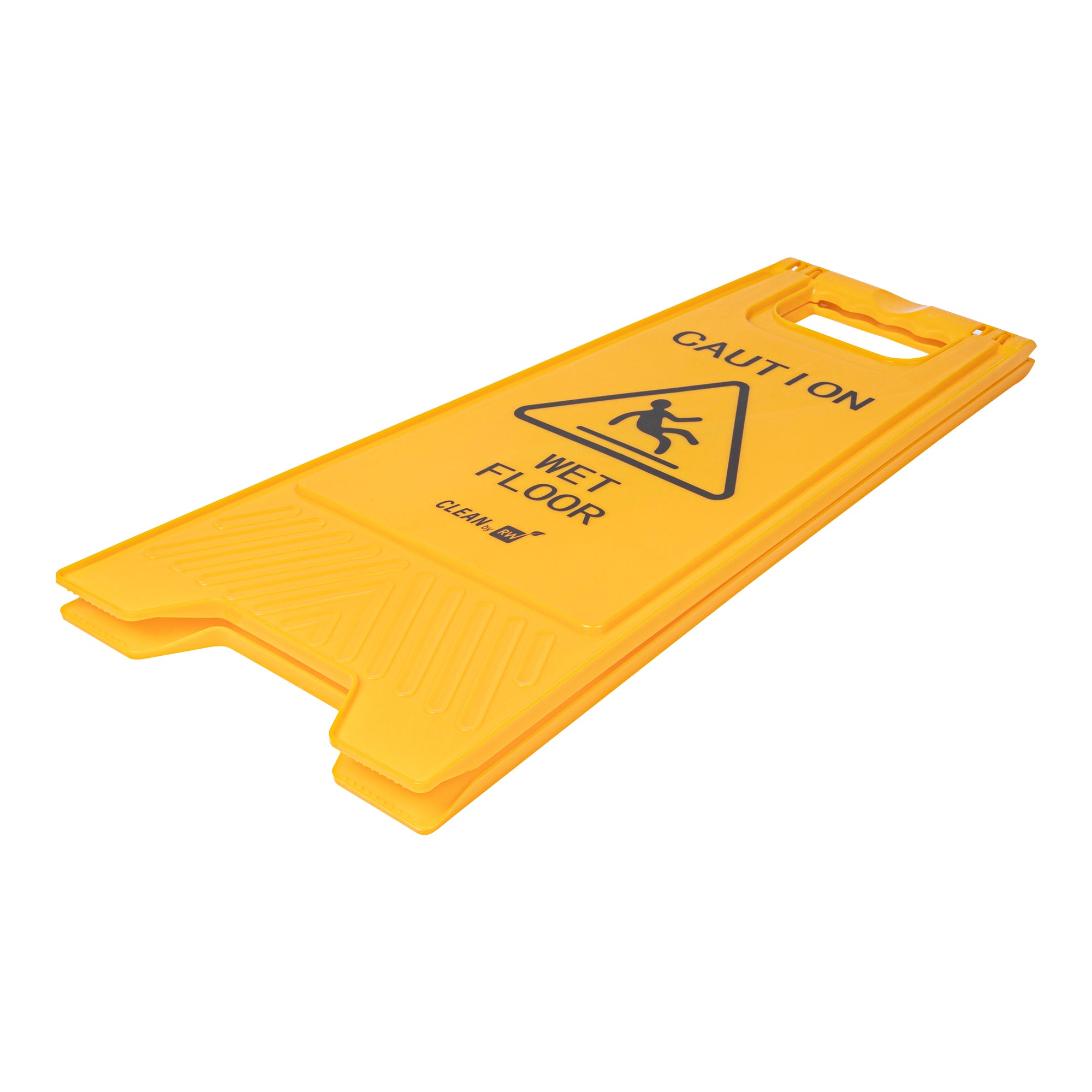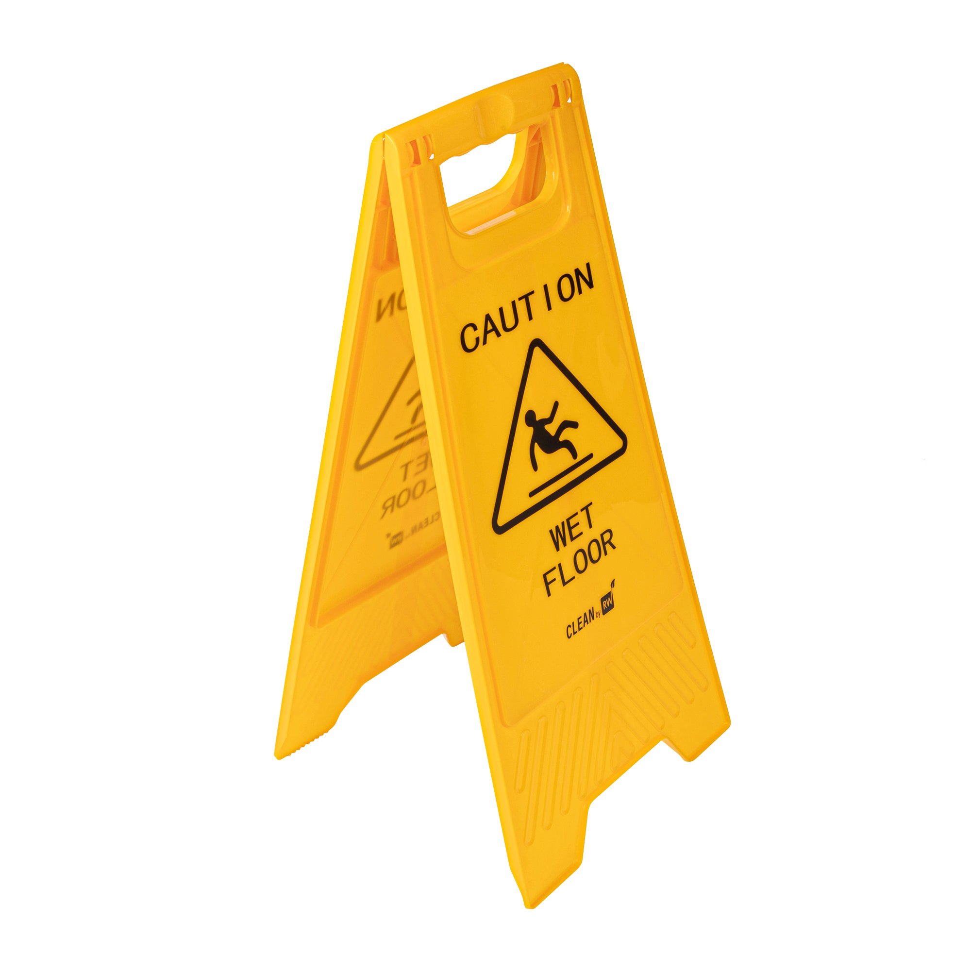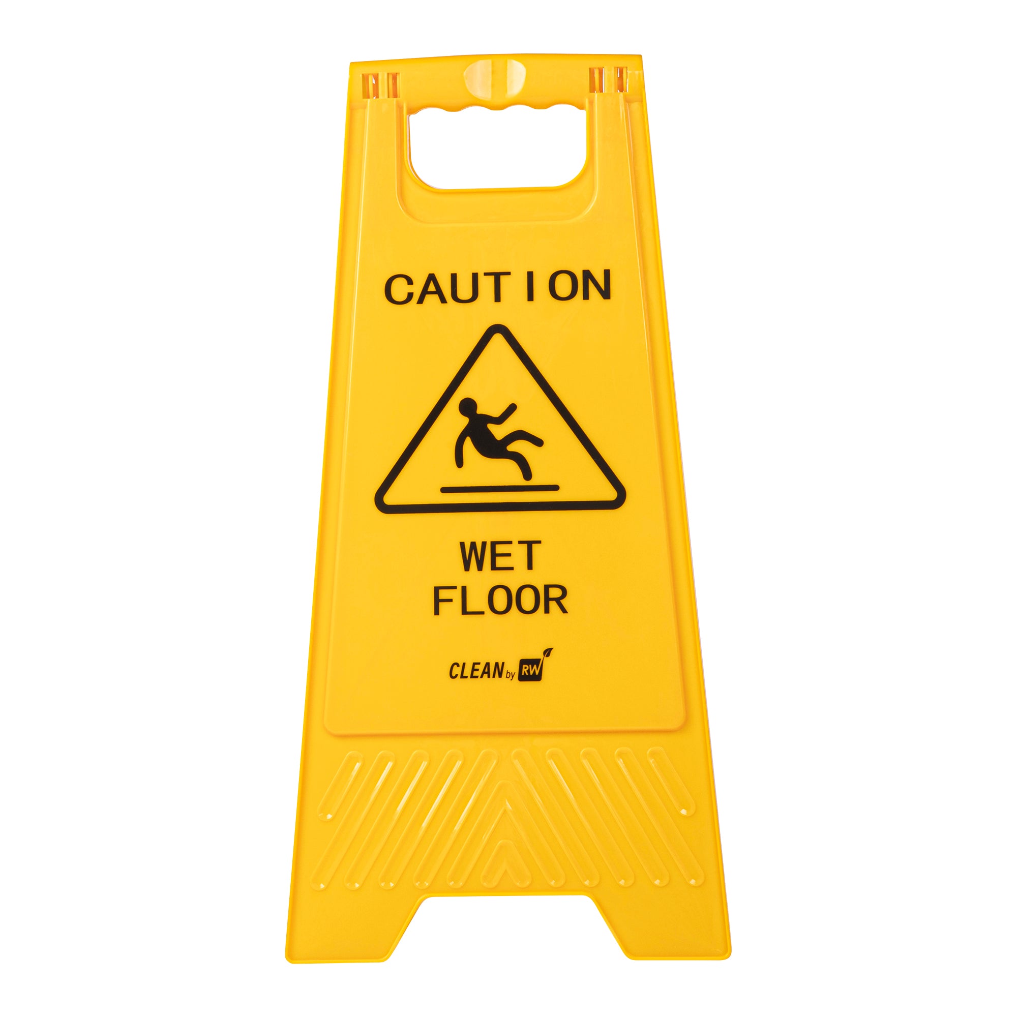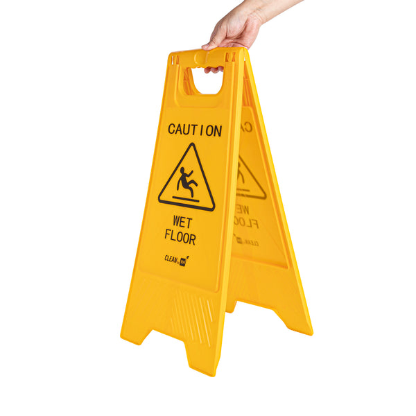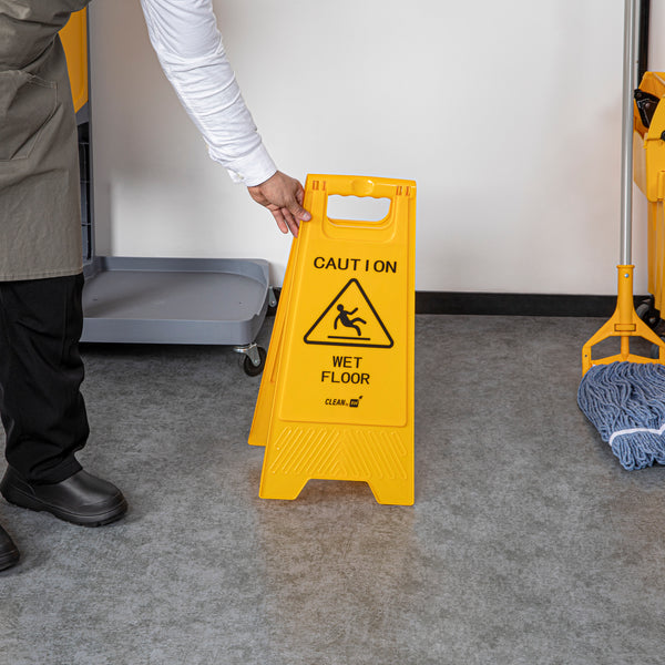 Promote safety and prevent accidents with our RW Clean Yellow Plastic Caution Wet Floor Sign. Featuring a bright yellow design with distinct black text, this lightweight wet floor sign reads "CAUTION WET FLOOR" to visibly alert customers to avoid the area. This plastic wet floor sign has text and graphics on both sides to vividly warn customers of possible accidents and to be extra cautious. Made from premium plastic, this caution wet floor sign has a built-in handle that makes it easy to transport and set up near messes at your hotel, bakery, or restaurant.The foldable design of this floor sign provides space-saving storage in your establishment's supply closet. This caution wet sign measures 11.75 inches long by 2 inches wide by 24.5 inches tall. Shipped in a 1 count box.