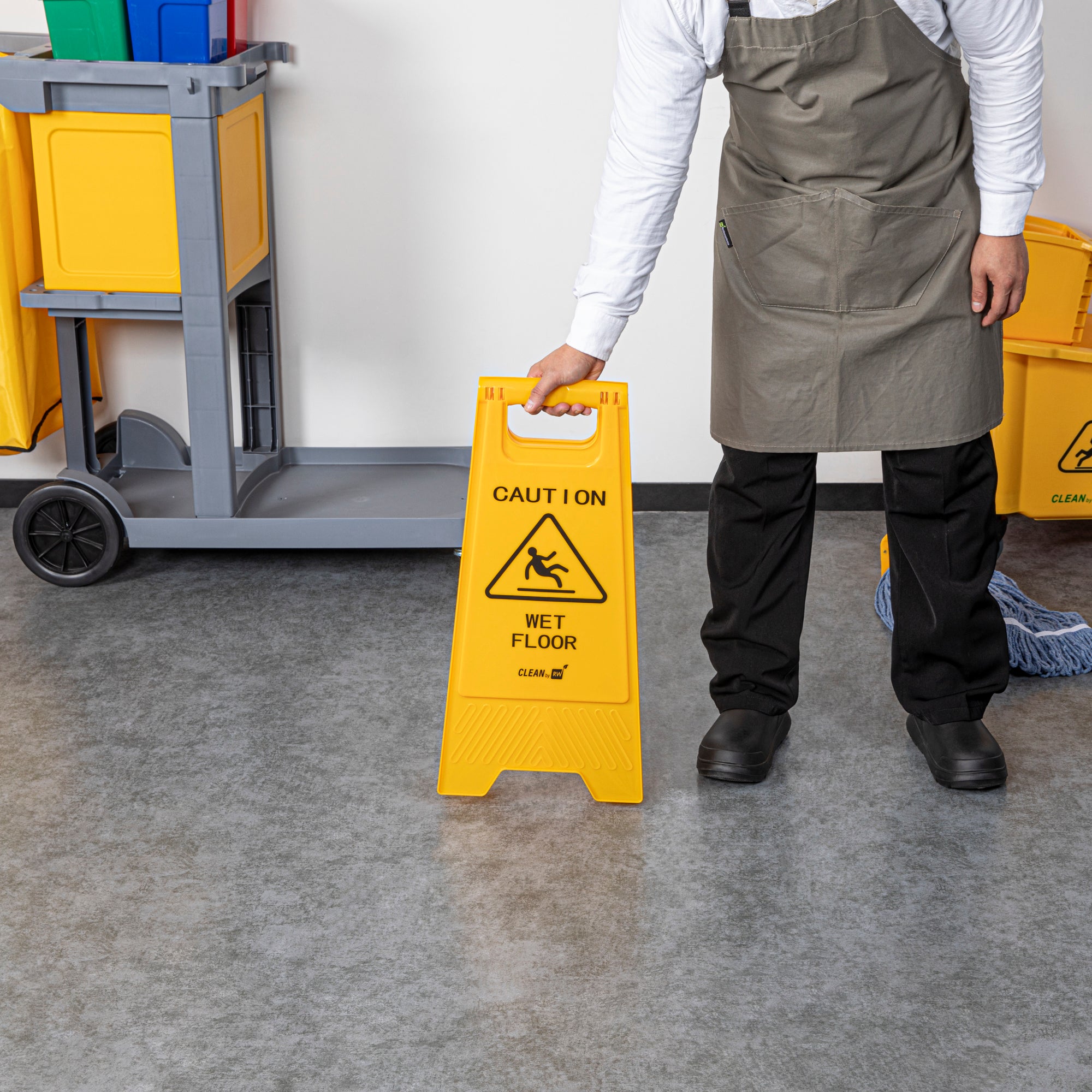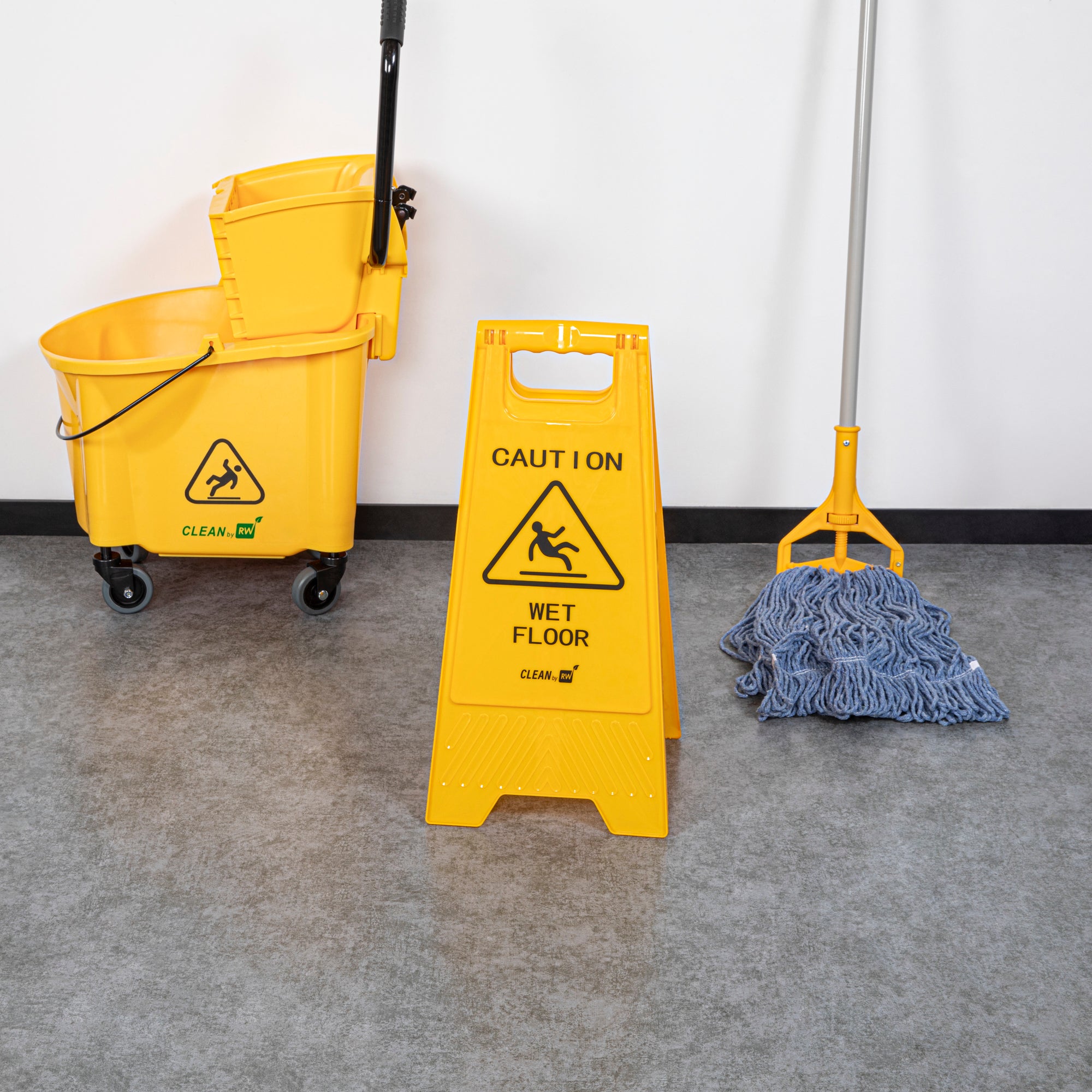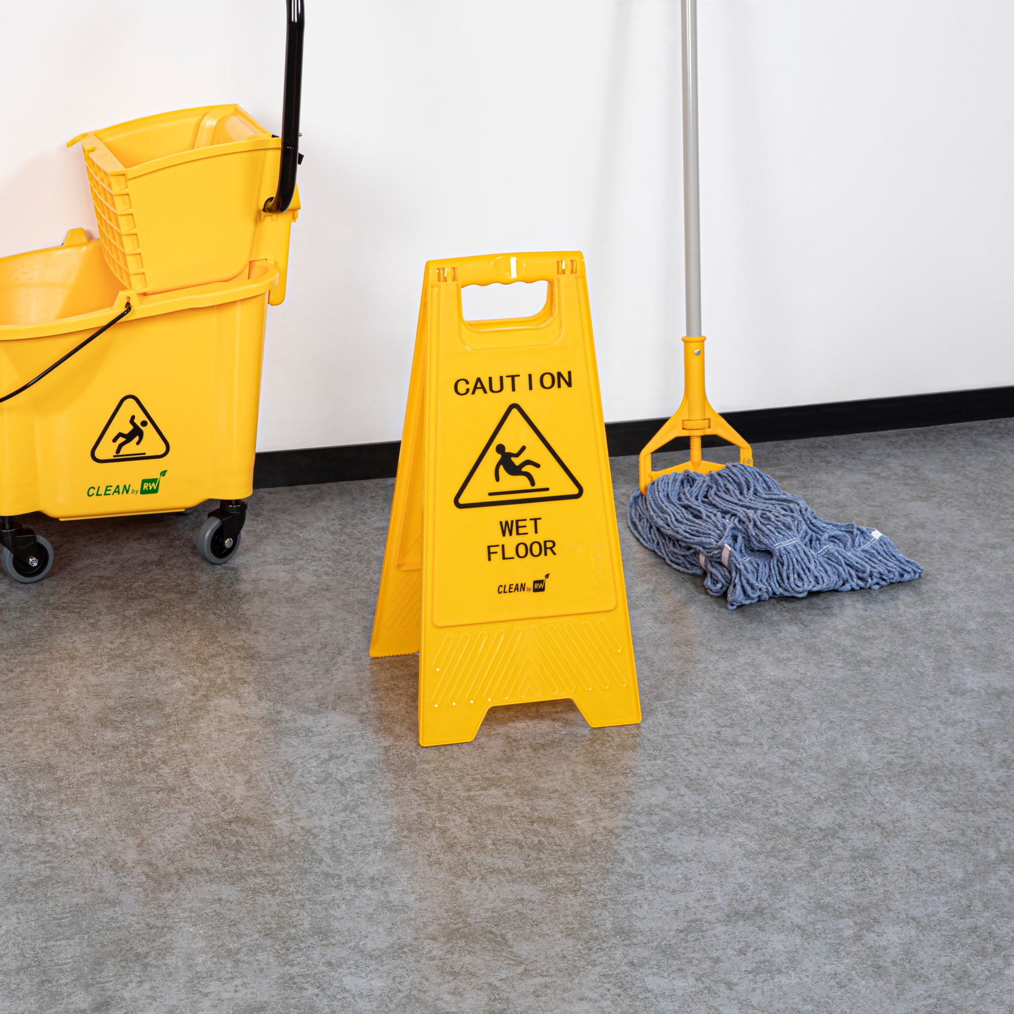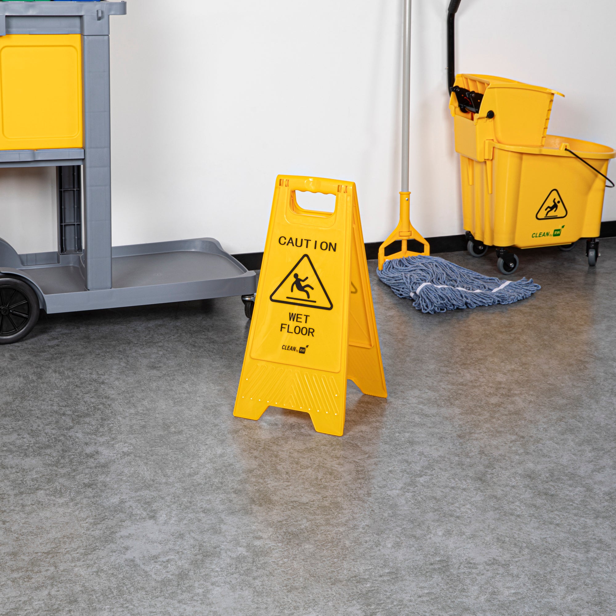 Promote safety and prevent accidents with our RW Clean Yellow Plastic Caution Wet Floor Sign. Featuring a bright yellow design with distinct black text, this lightweight wet floor sign reads "CAUTION WET FLOOR" to visibly alert customers to avoid the area. This plastic wet floor sign has text and graphics on both sides to vividly warn customers of possible accidents and to be extra cautious. Made from premium plastic, this caution wet floor sign has a built-in handle that makes it easy to transport and set up near messes at your hotel, bakery, or restaurant.The foldable design of this floor sign provides space-saving storage in your establishment's supply closet. This caution wet sign measures 11.75 inches long by 2 inches wide by 24.5 inches tall. Shipped in a 1 count box.
