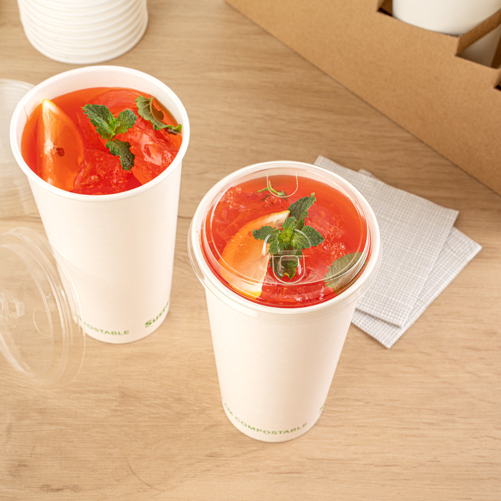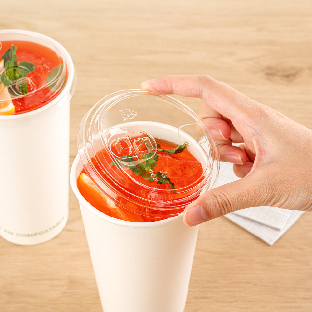 Made from sustainable materials, these disposable cold cup lids are crafted from either paper lined with PLA or PLA plastic itself. Show your commitment to the earth while enjoying your drinks.
