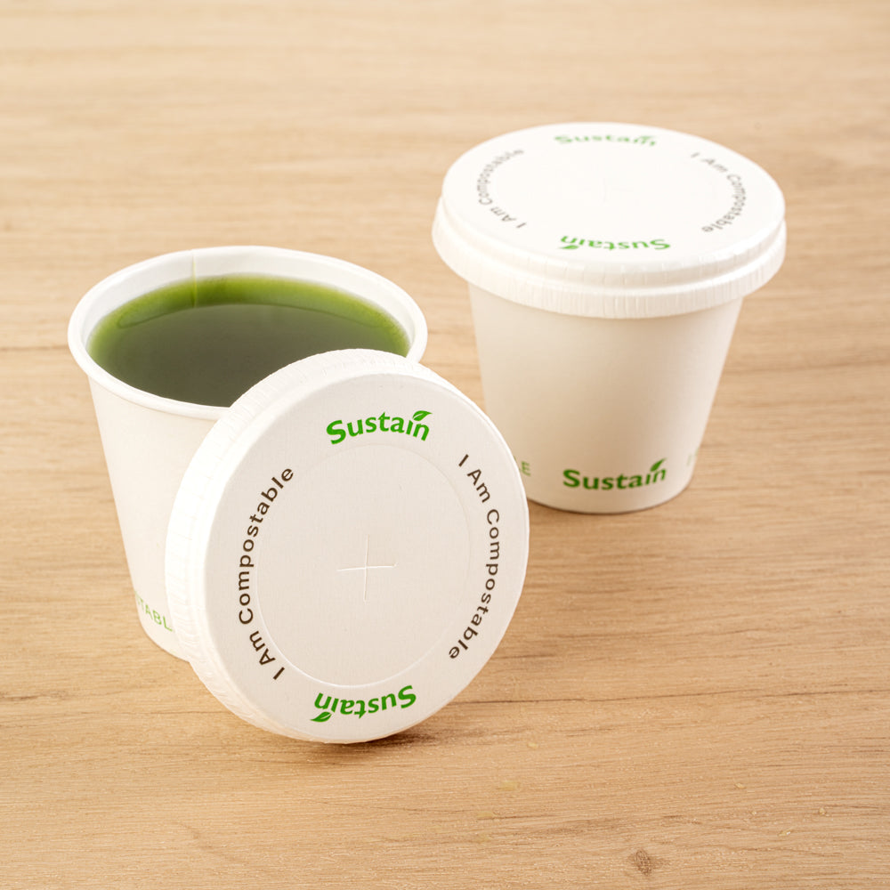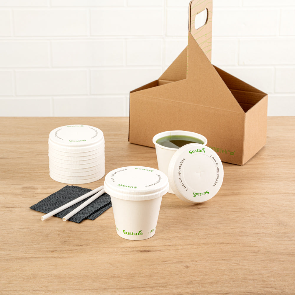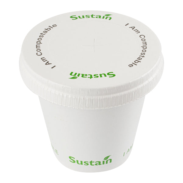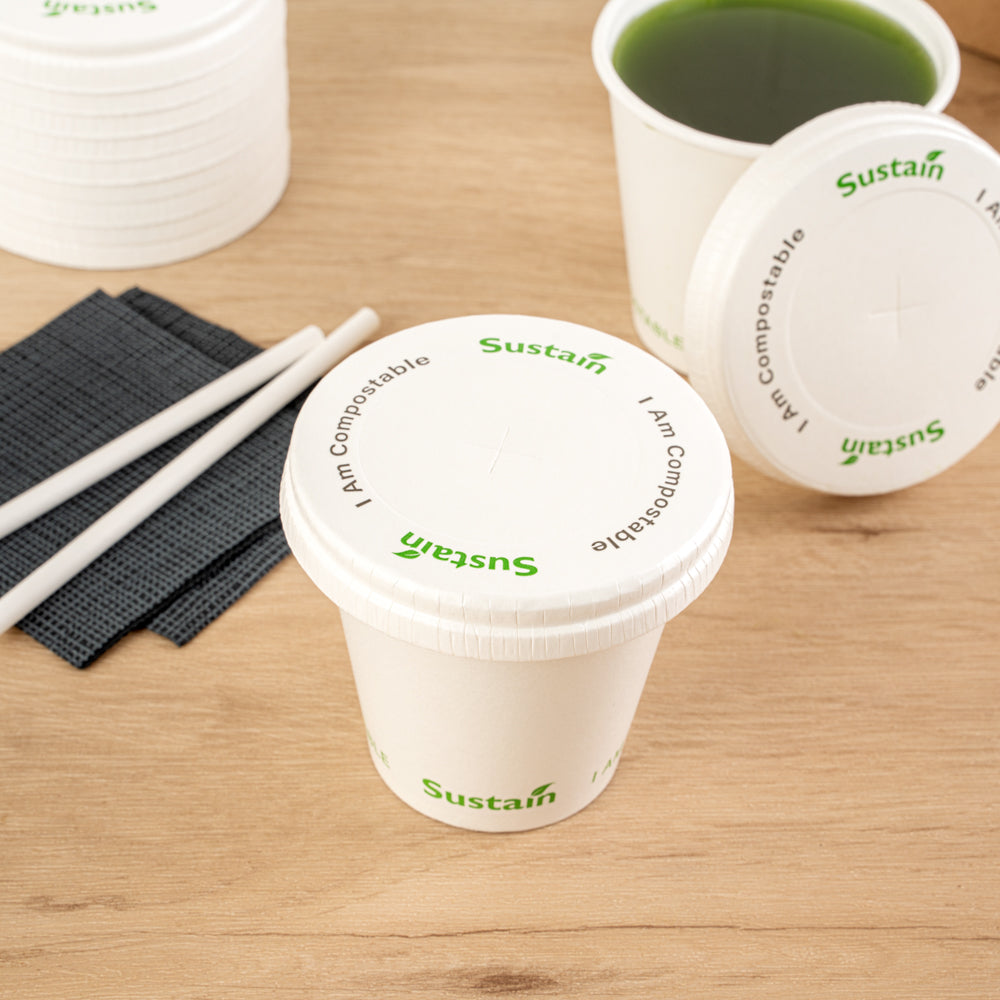 Optimize your beverage service with leakproof, eco-friendly solutions. Sustain Leakproof White Compostable Cup Lids – Universal Fit, Paper – 3.54 inches by 3.54 inches ensures a secure seal to prevent spills, making them the ideal compostable cup lids for quick-service restaurants and cafes. Made from PLA-lined paper, these lids provide a leak-resistant barrier that supports cold beverage service while aligning with sustainability initiatives. Featuring a convenient straw slot, these drink lids with straw slots allow easy access to refreshments without removing the lid, enhancing customer experience. Their universal fit accommodates various cup sizes (9, 12, 16, 20, and 22 ounces), simplifying inventory management and reducing the need for multiple lid types. The flat, durable design supports efficient stacking and storage, making these disposable cup lids a valuable addition to any foodservice operation. Secure your beverage service effortlessly today with these eco-conscious lids. Each order includes 1000 Sustain Leakproof White Compostable Cup Lids.