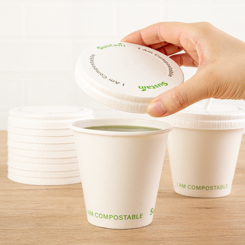 Optimize your beverage service with leakproof, eco-friendly solutions. Sustain Leakproof White Compostable Cup Lids – Universal Fit, Paper – 3.54 inches by 3.54 inches ensures a secure seal to prevent spills, making them the ideal compostable cup lids for quick-service restaurants and cafes. Made from PLA-lined paper, these lids provide a leak-resistant barrier that supports cold beverage service while aligning with sustainability initiatives. Featuring a convenient straw slot, these drink lids with straw slots allow easy access to refreshments without removing the lid, enhancing customer experience. Their universal fit accommodates various cup sizes (9, 12, 16, 20, and 22 ounces), simplifying inventory management and reducing the need for multiple lid types. The flat, durable design supports efficient stacking and storage, making these disposable cup lids a valuable addition to any foodservice operation. Secure your beverage service effortlessly today with these eco-conscious lids. Each order includes 50 Sustain Leakproof White Compostable Cup Lids.