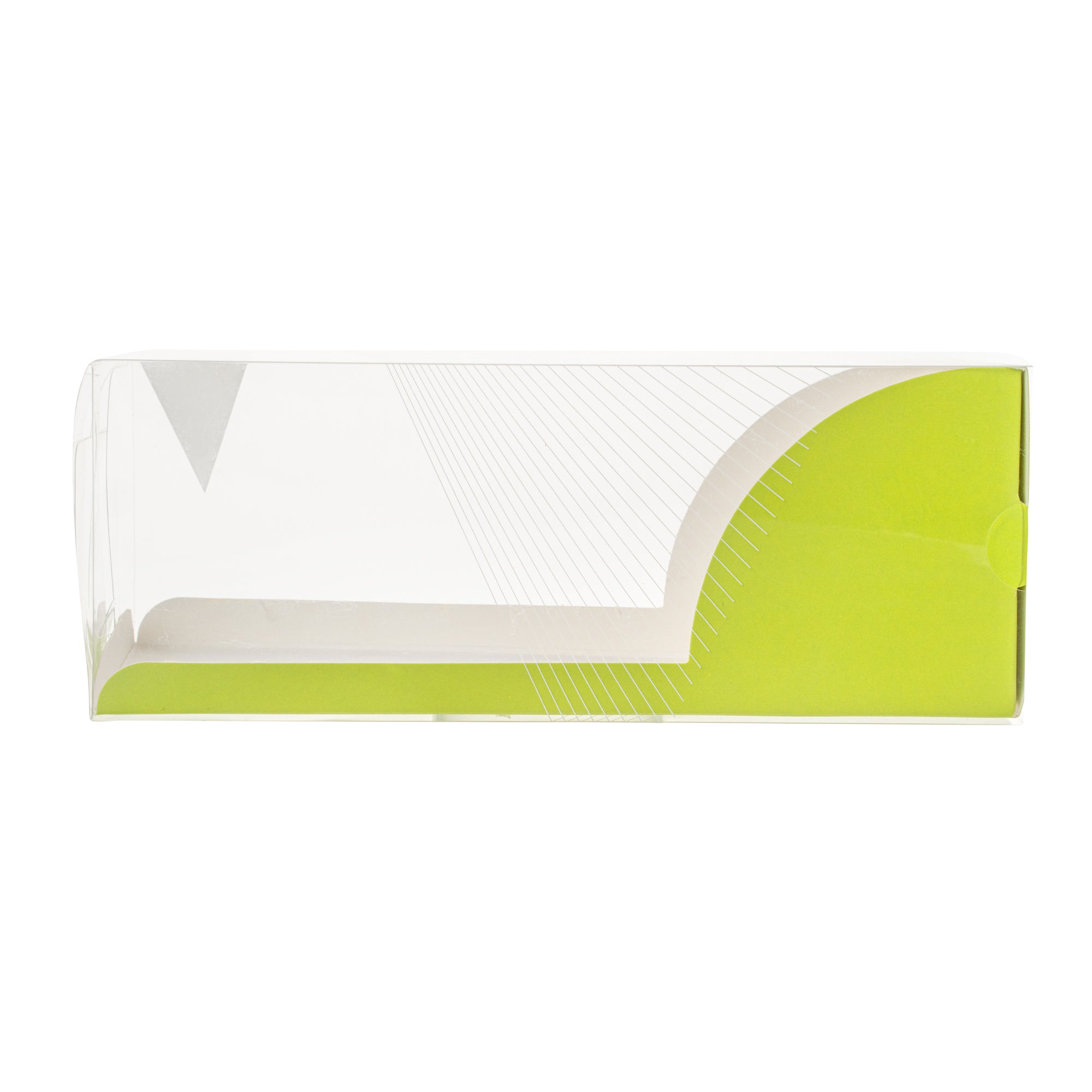 CLEAR PLASTIC ECLAIR BOX - GREEN PAPER SLEEVE, GEOMETRIC LINE ACCENT