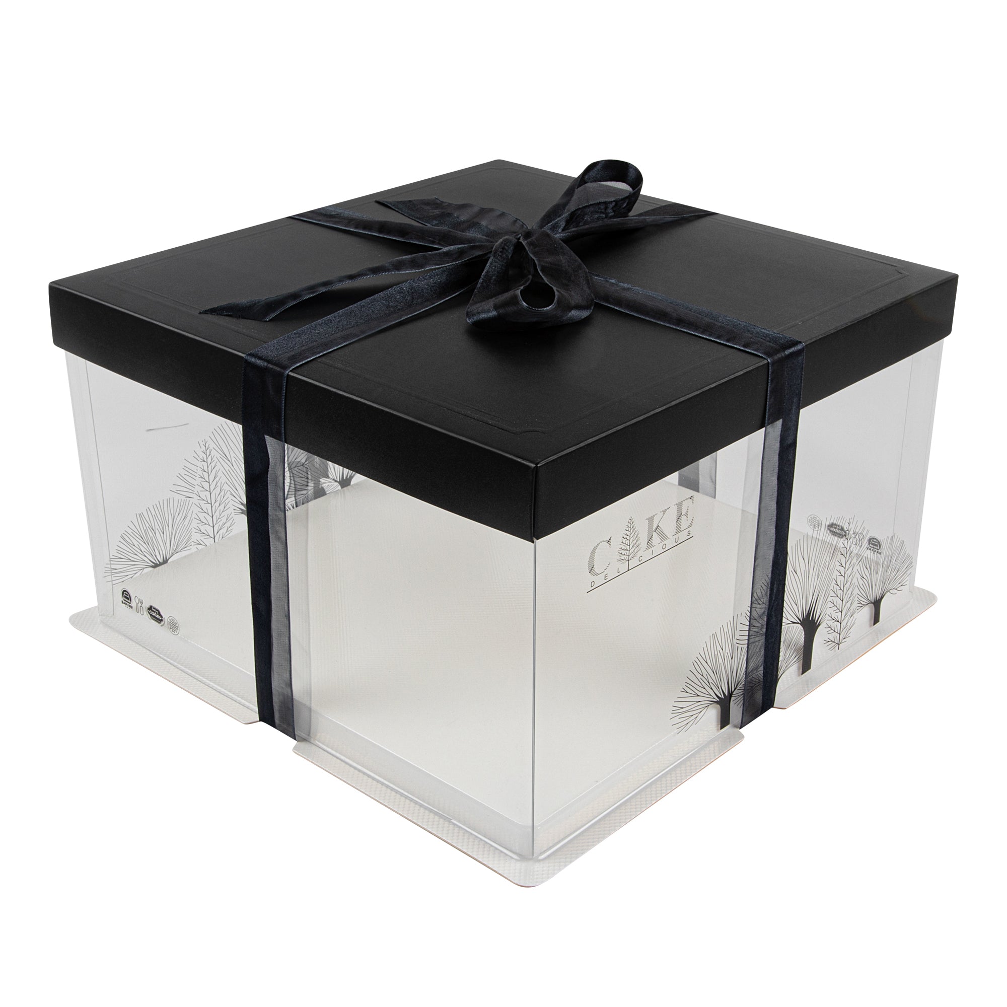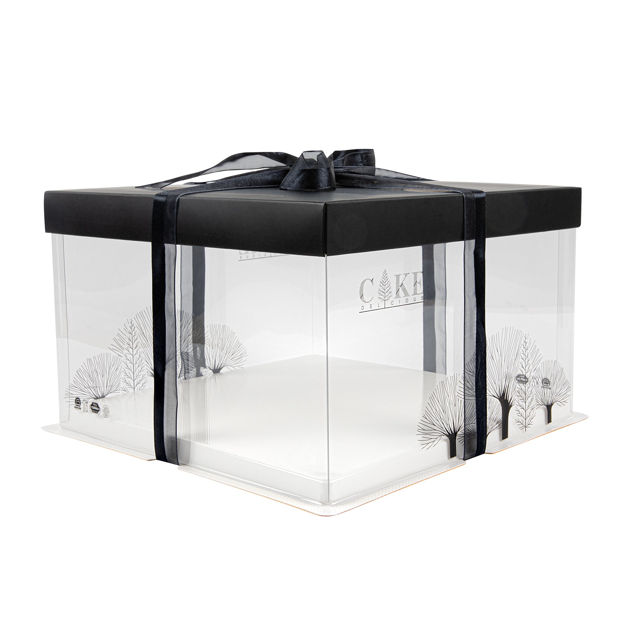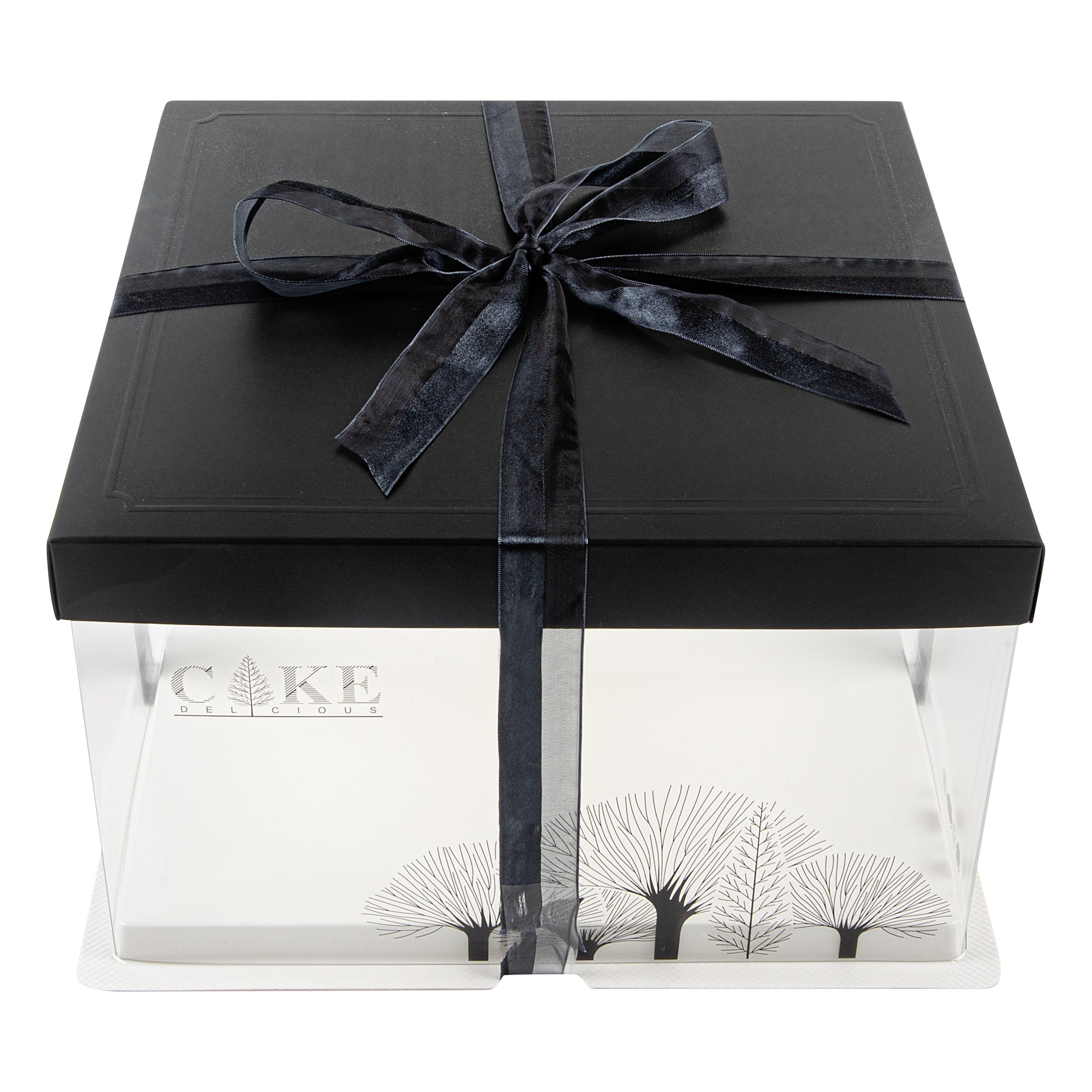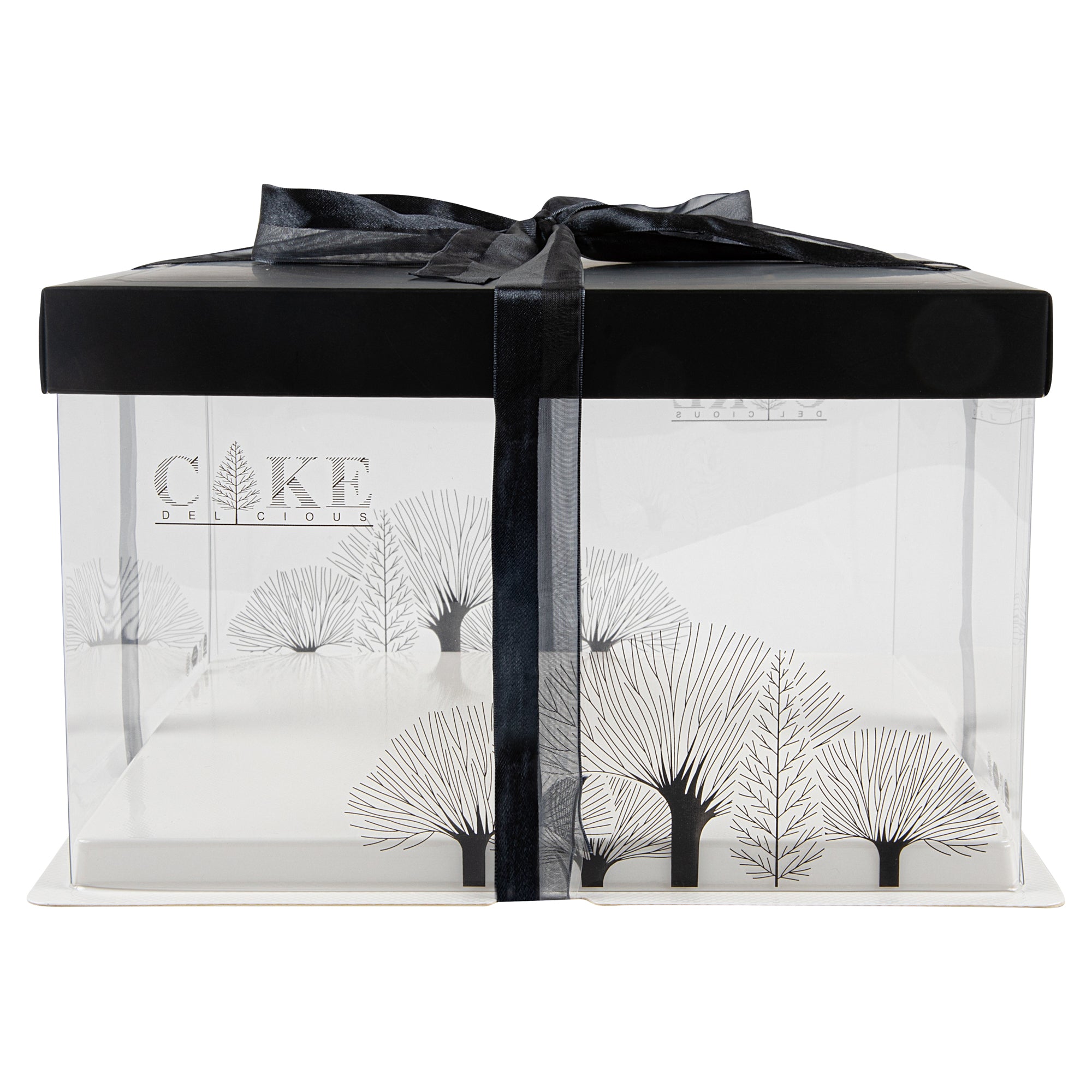 PLASTIC CAKE BOX - BLACK LID AND WHITE BASE, BLACK RIBBON, TREE ACCENT