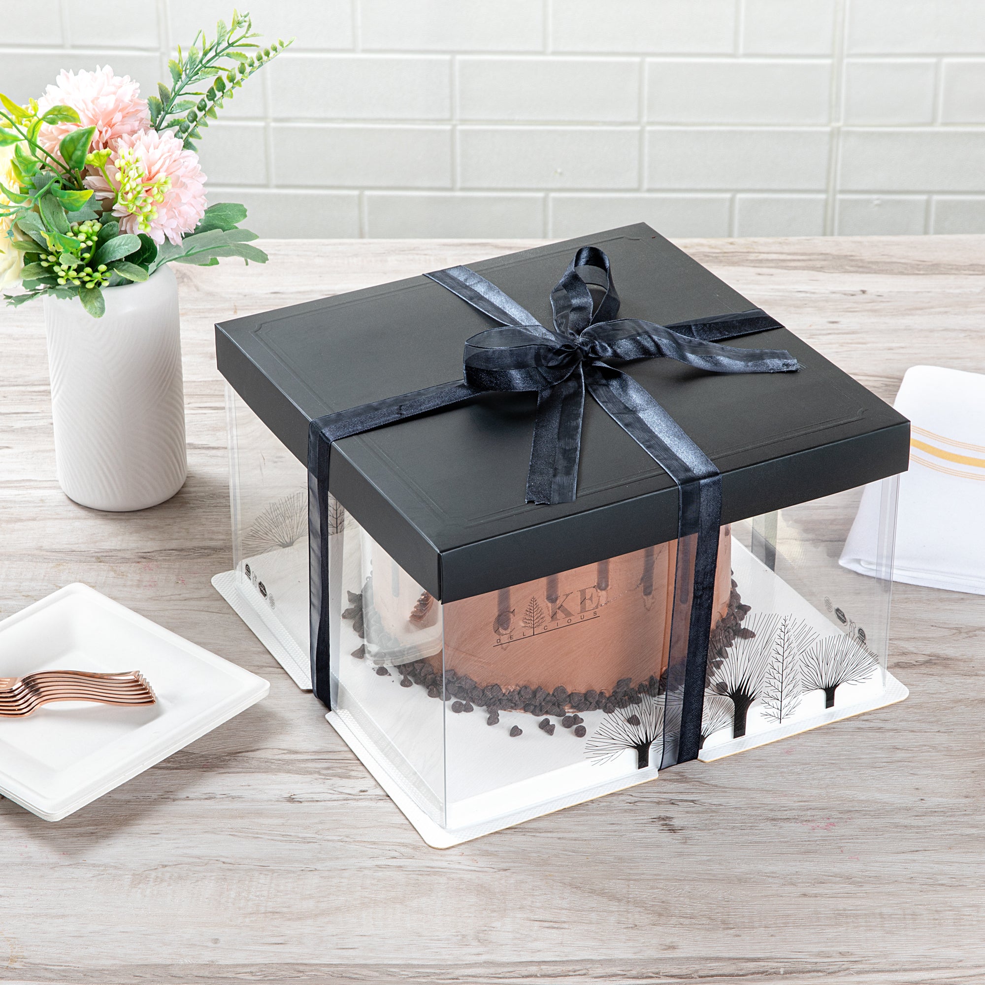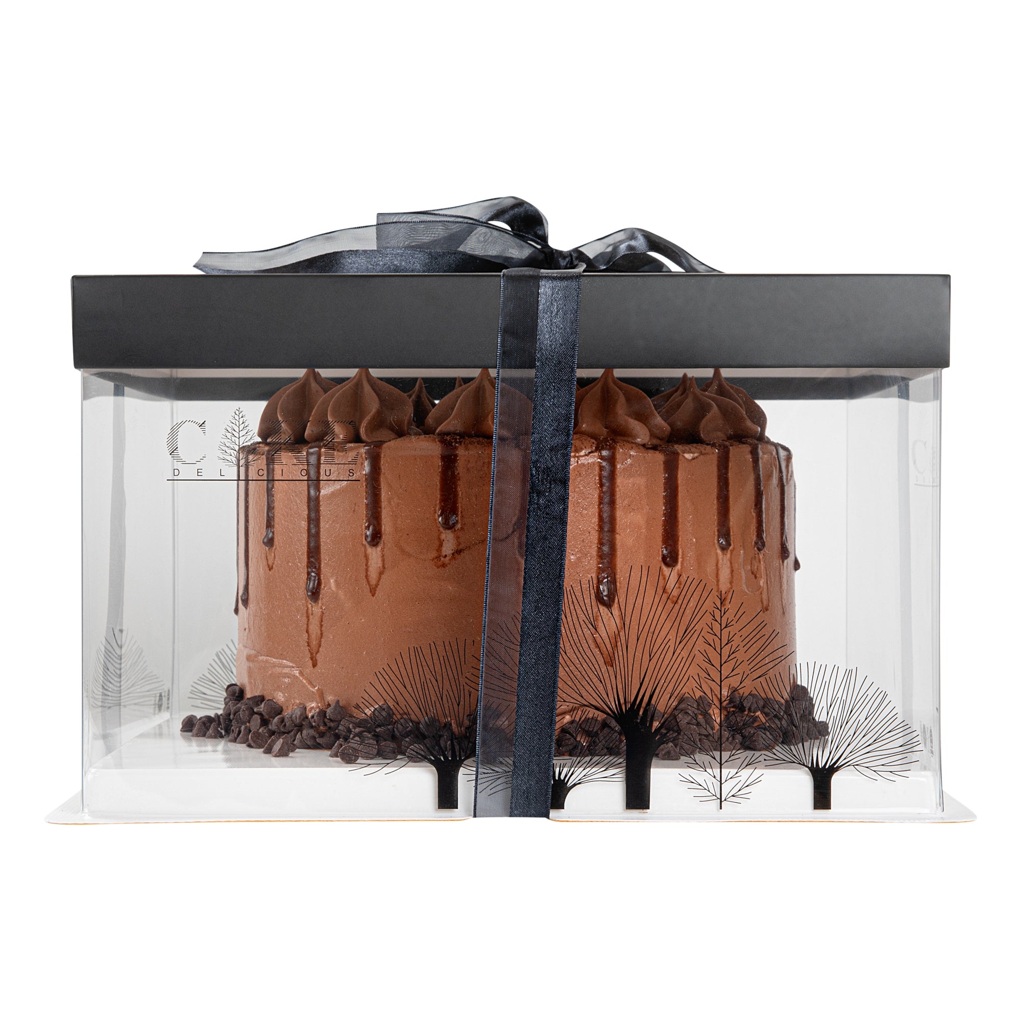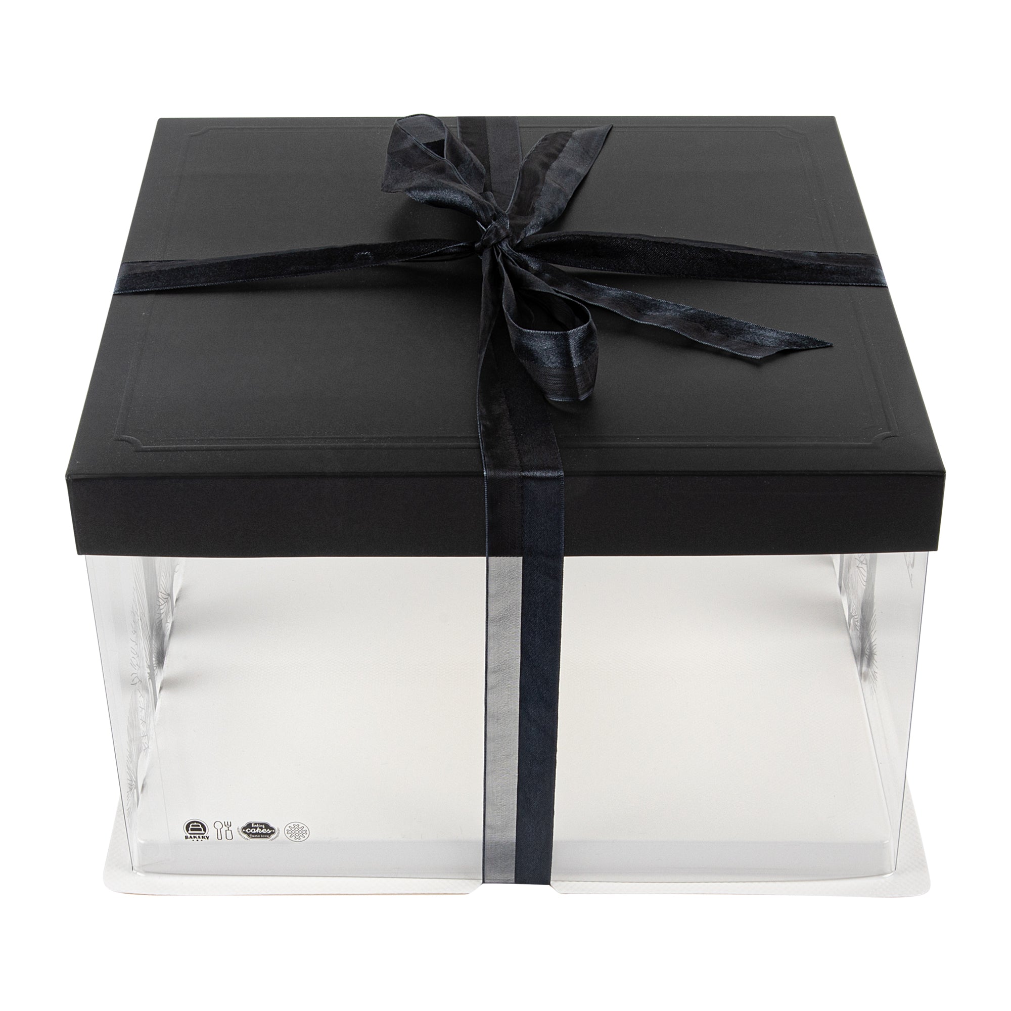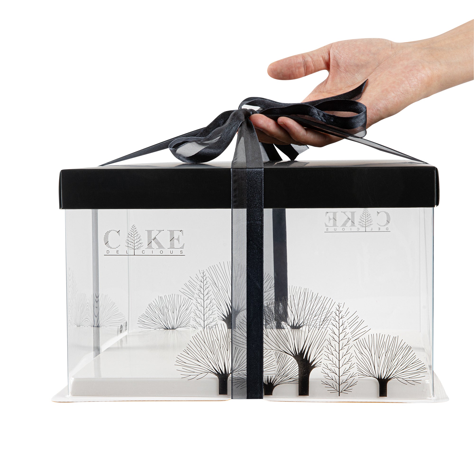 PLASTIC CAKE BOX - BLACK LID AND WHITE BASE, BLACK RIBBON, TREE ACCENT