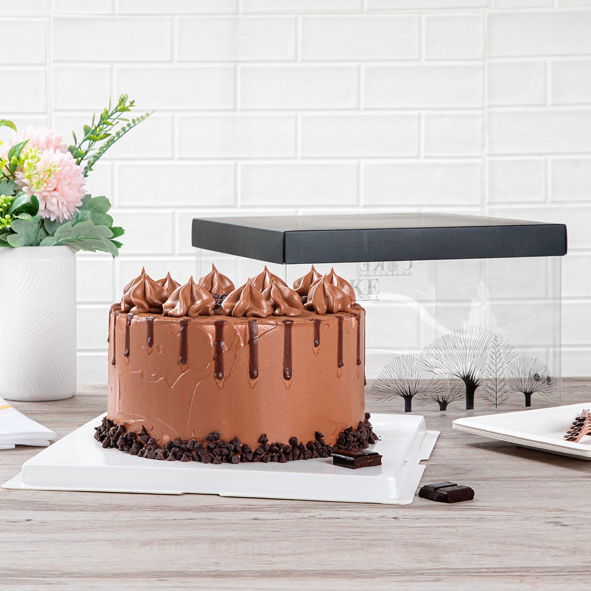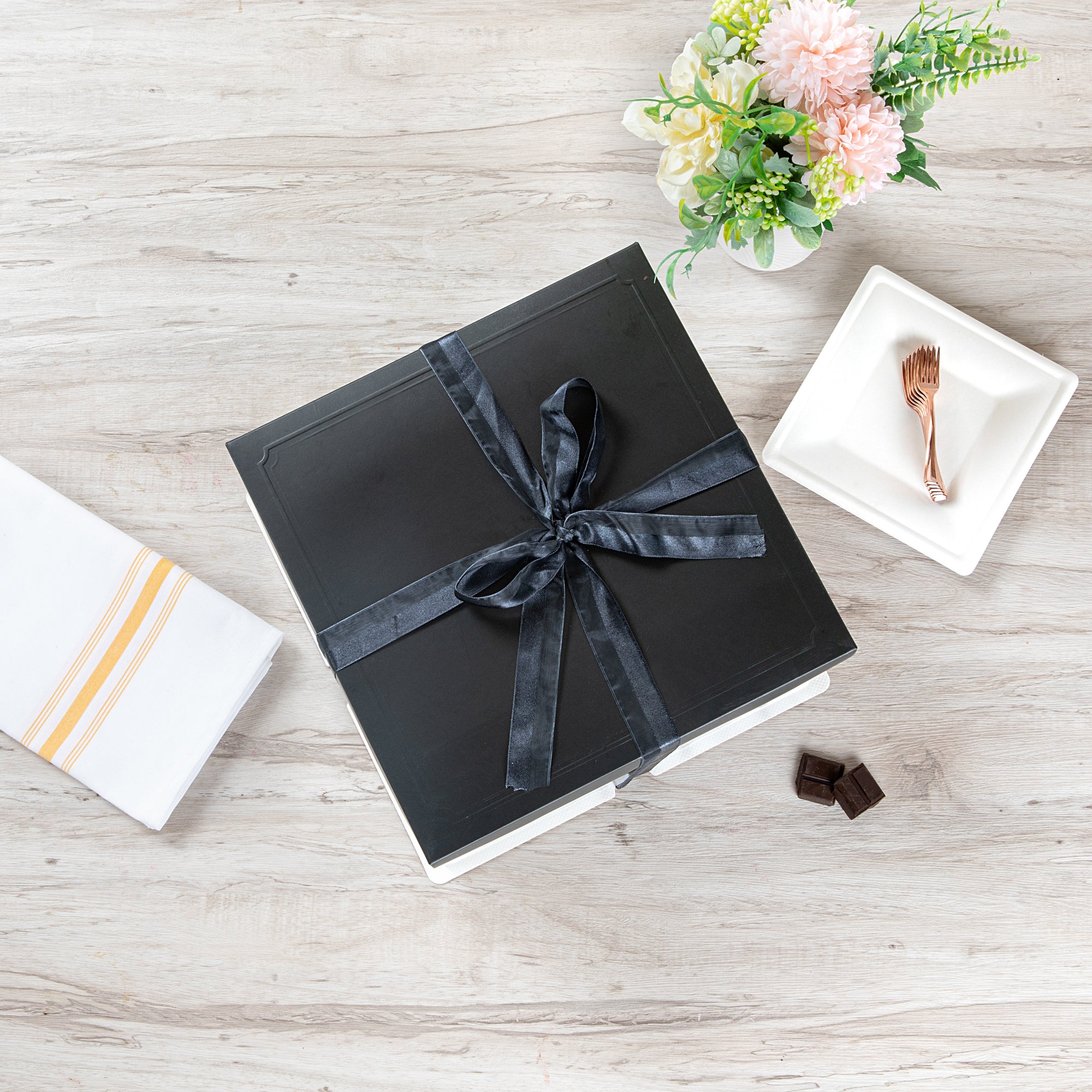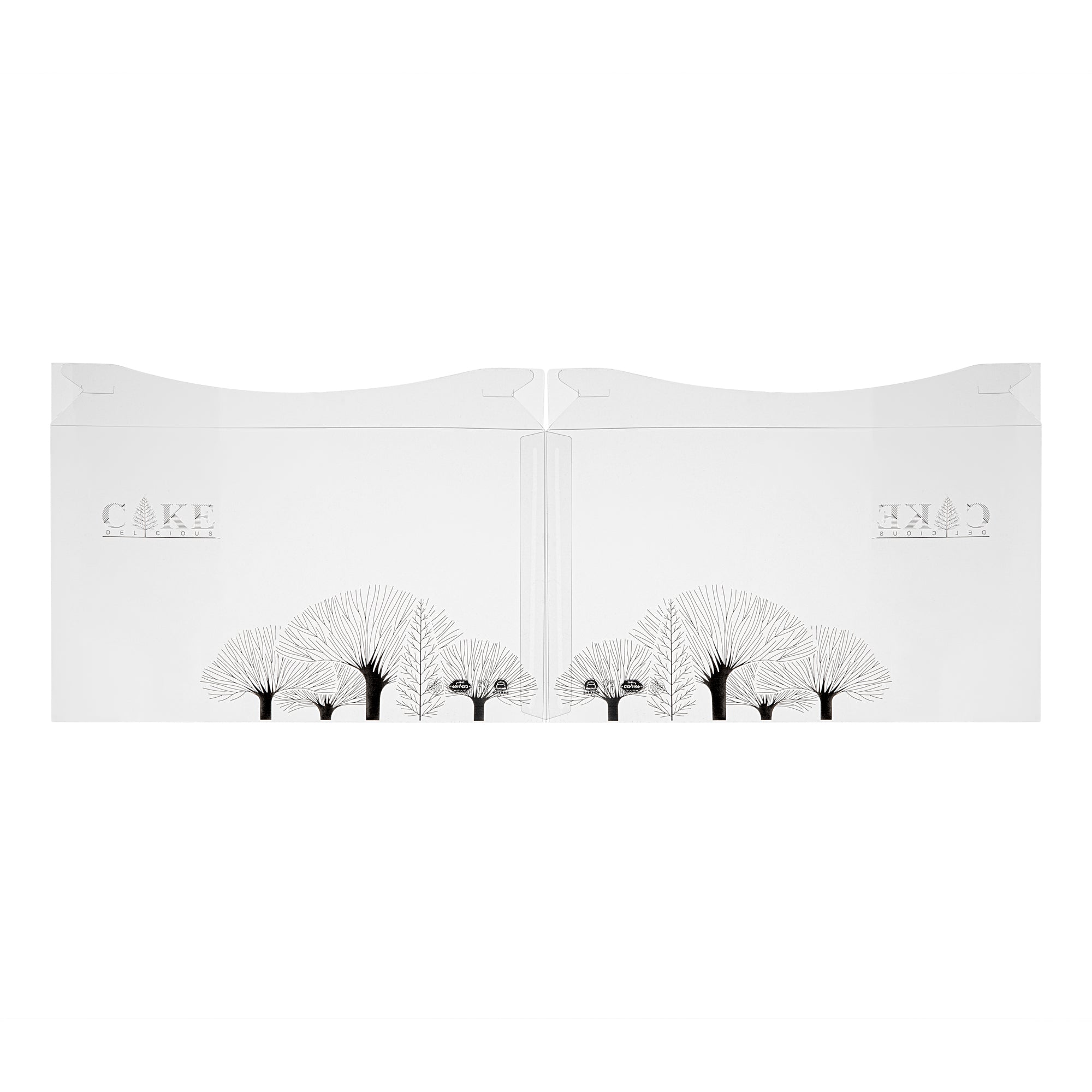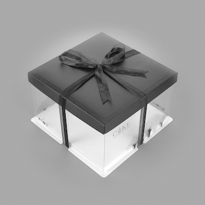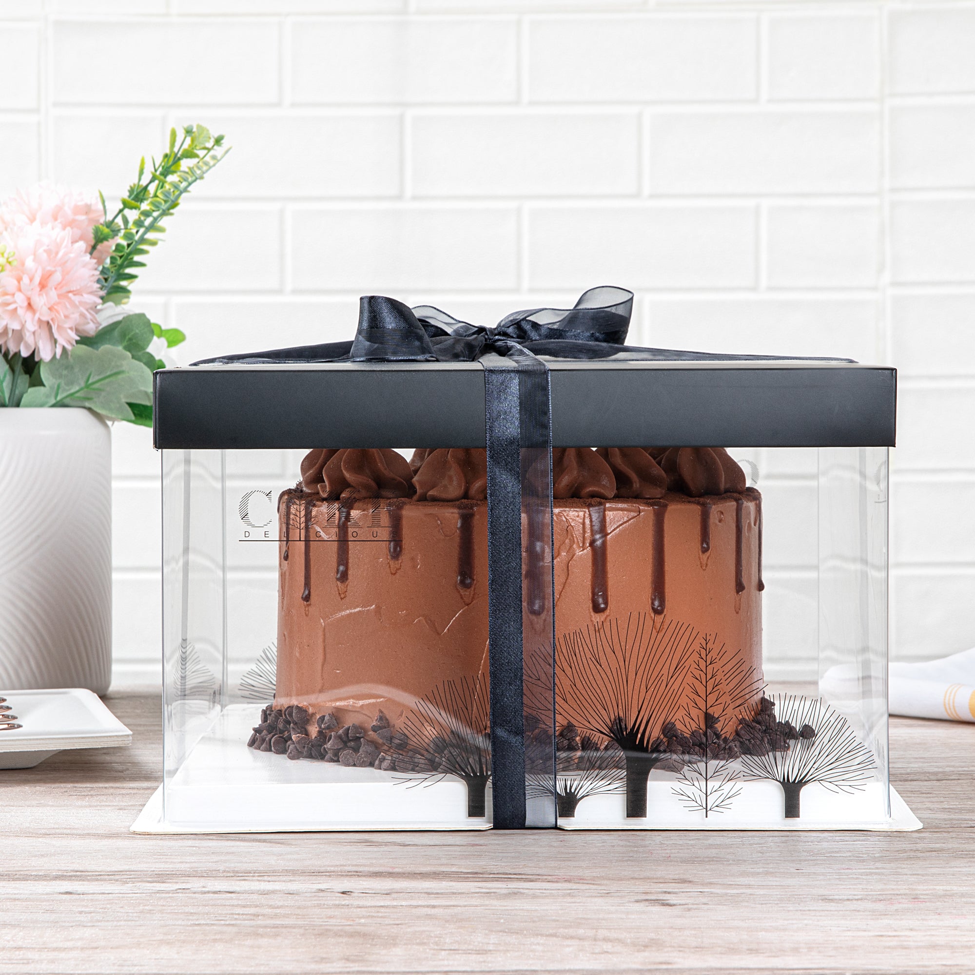 PLASTIC CAKE BOX - BLACK LID AND WHITE BASE, BLACK RIBBON, TREE ACCENT