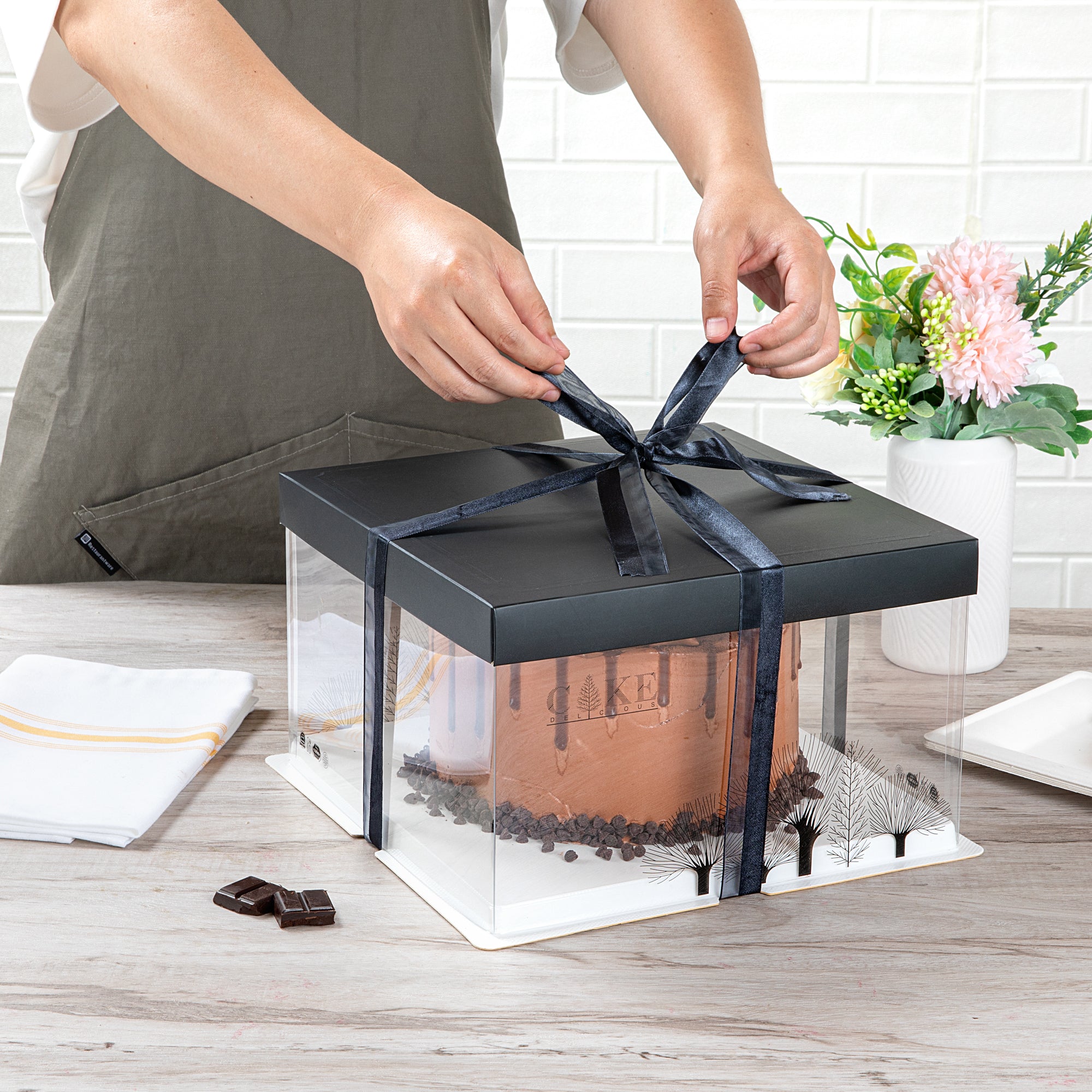 Every order includes 10 bases, 10 lids, 10 plastic containers, and ribbon, providing you with all the essentials to easily build your cake boxes. Conveniently package all types of baked goods for special occasions.