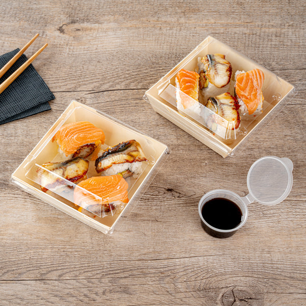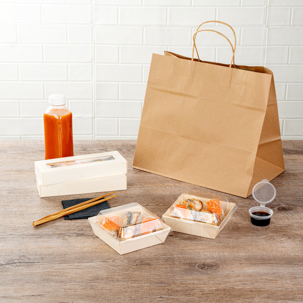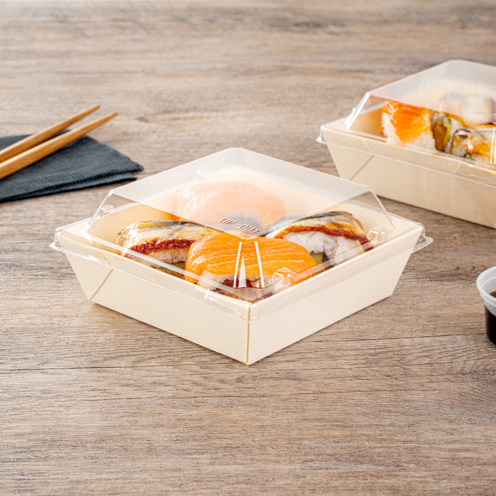 Ensure secure transport for your meals with our Taipei Clear Plastic Lids. Made of premium plastic, these transparent lids have a sturdy and durable construction that won't crack easily. Pair these clear plastic lids with their coordinating poplar food containers (SKU:RWB0371) to form a tight seal for your take out orders. These durable plastic lids have an elevated design to provide more room for food toppings. The clear finish of these food container lids allows guests to instantly look at their contents without the need to open them. These disposable square container lids are recyclable to facilitate an environmentally friendly cleanup. Each plastic lid measures 5.25 inches in length by 5.25 inches in width by 1 inch in height. Sold in a 100 count box. Lids and containers are sold separately.