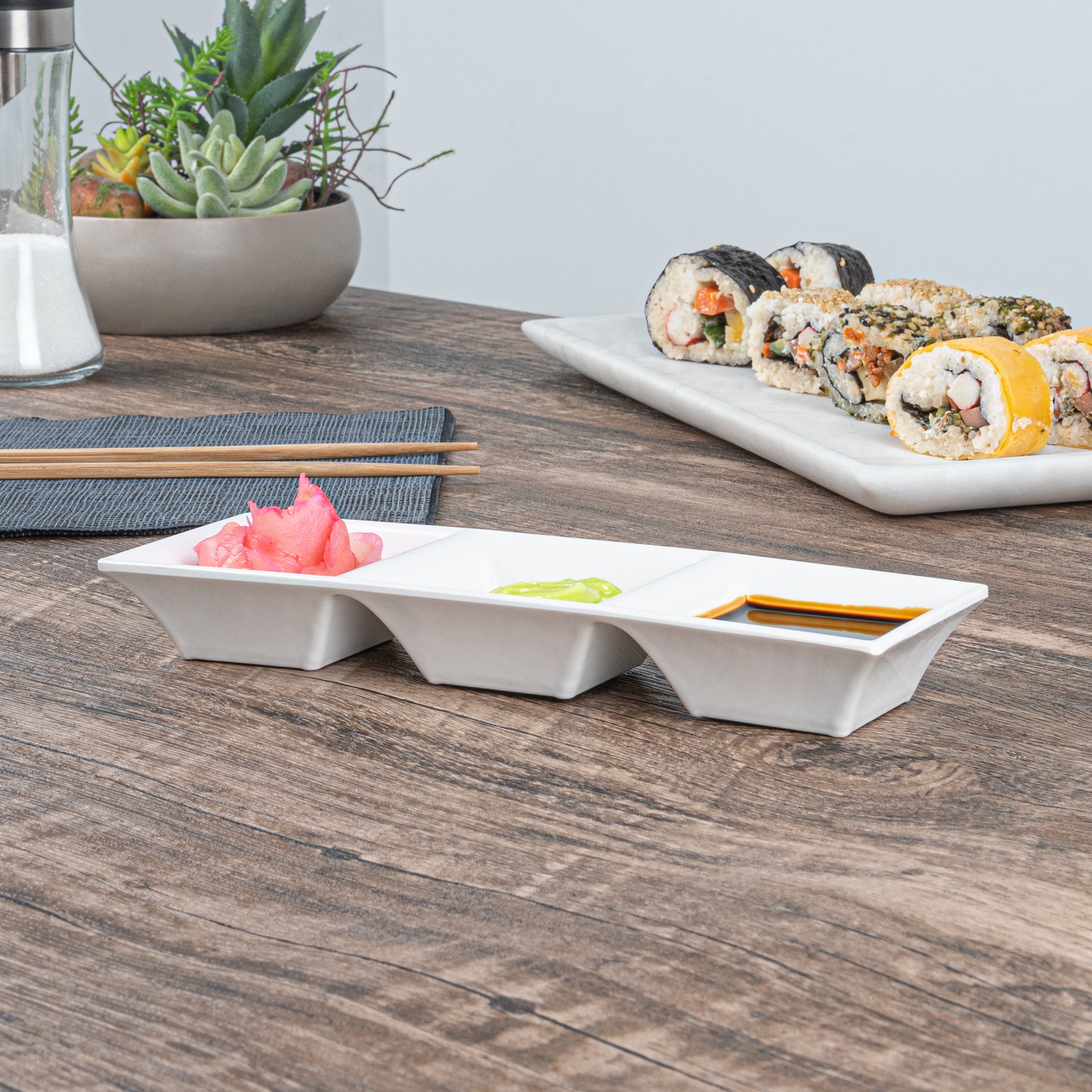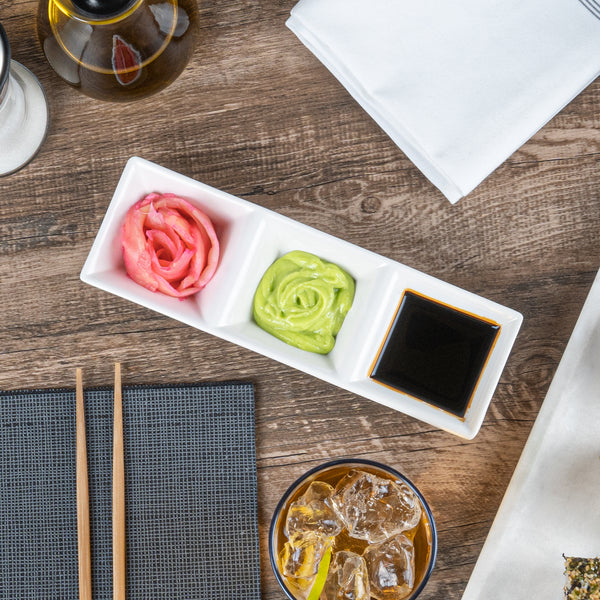 Serve a selection of dipping sauces and condiments with our Voga 5-ounce Square White Melamine Triplets Set. Crafted from high-quality melamine, these rectangle plates are durable to withstand your rigorous restaurant service. These serving trays combine a multifunctional design with sleek modern style and acts as three small dishes for sauces, condiments, and glazes. To prevent annoying spills and messes, the dipping bowls of these sauce dishes are deep set. For a simple cleanup, these white plates can be used in the top rack of a dishwasher. Ideal for restaurants and catering companies, these condiment container plates can be used to serve a variety of accoutrements alongside a freshly grilled steak or a selection of soy sauce and other condiments alongside a spicy tuna roll. The bright white finish of these condiment bowls easily matches any venue or decor. These melamine plates measures 8.75 inches in length by 2.75 inches in width by 1 inch in height and can hold up to 5 ounces. Shipped in a 10 count box.